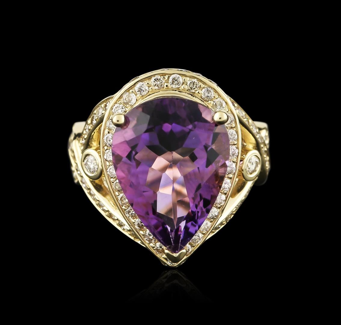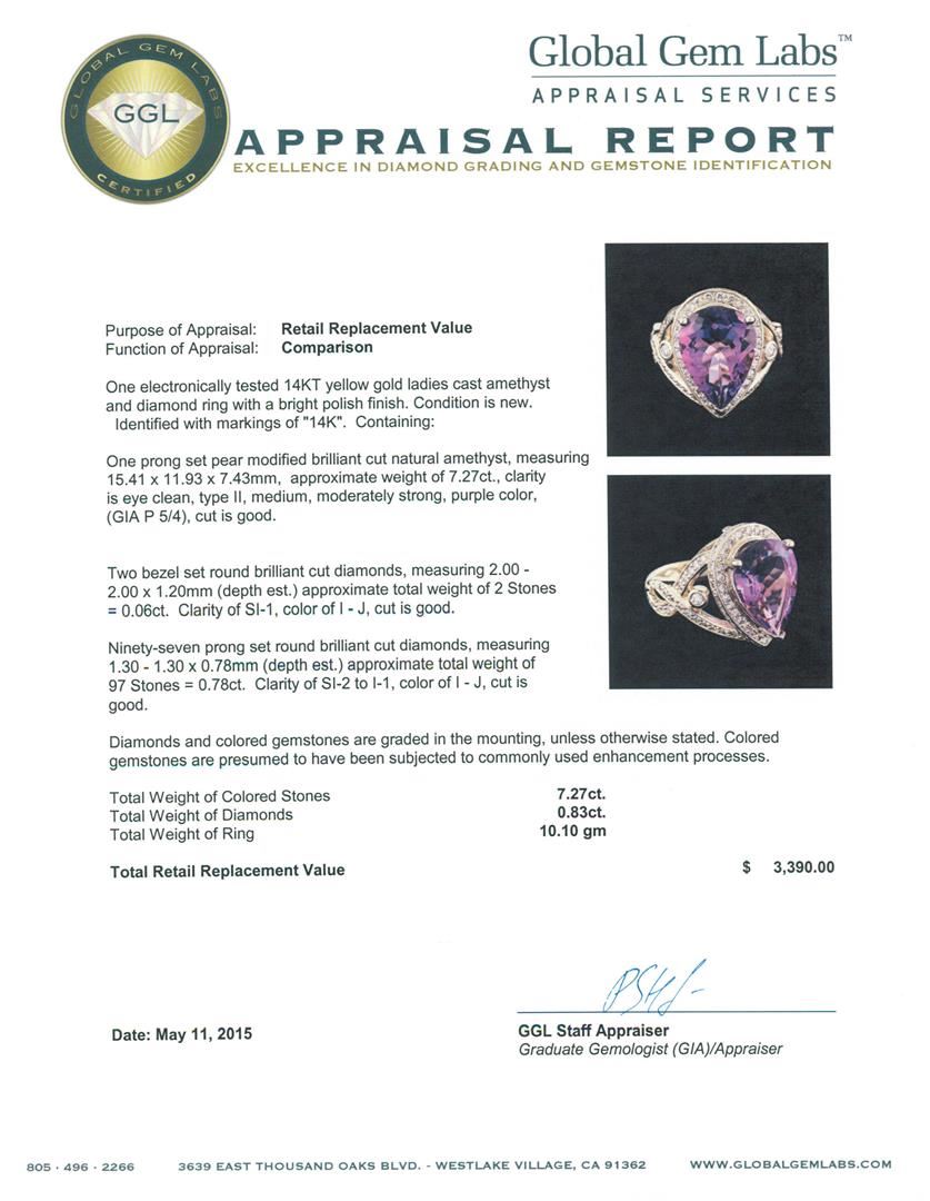 One electronically tested 14KT yellow gold ladies cast amethyst and diamond ring with a bright polish finish. Identified with markings of "14K". Condition is new. Containing: One prong set pear modified brilliant cut natural amethyst, measuring 15.41 x 11.93 x 7.43mm, approximate weight of 7.27ct., clarity is eye clean, type II, medium, moderately strong, purple color, (GIA P 5/4), cut is good. Two bezel set round brilliant cut diamonds, measuring 2.00 - 2.00 x 1.20mm (depth est.) approximate total weight of 2 Stones = 0.06ct. Clarity: SI-1. Color: I - J, Cut is Good. Ninety-Seven prong set round brilliant cut diamonds, measuring 1.30 - 1.30 x 0.78mm (depth est.) approximate total weight of 97 Stones = 0.78ct. Clarity: SI-2 to I-1. Color: I - J, Cut is Good. Diamonds and colored gemstones are graded in the mounting, unless otherwise stated. Colored gemstones are presumed to have been subjected to commonly used enhancement processes. Total Weight of Colored Stones 7.27ct. Total Weight of Diamonds 0.83ct. Total Weight of Ring 10.10 grams. GGL Appraised at $3,390.00.