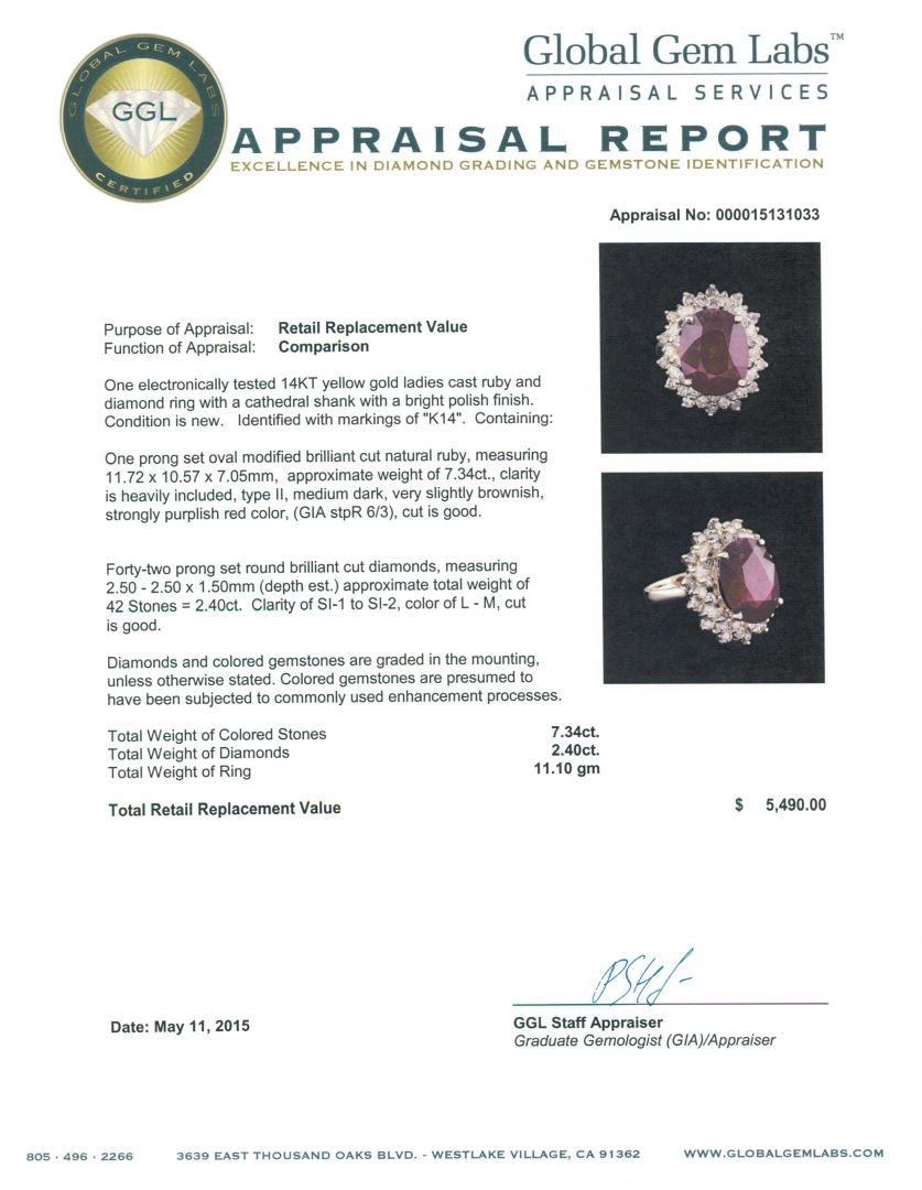 One electronically tested 14KT yellow gold ladies cast ruby and diamond ring with a cathedral shank with a bright polish finish. Identified with markings of "K14". Condition is new. Containing: One prong set oval modified brilliant cut natural ruby, measuring 11.72 x 10.57 x 7.05mm, approximate weight of 7.34ct., clarity is heavily included, type II, medium dark, very slightly brownish, strongly purplish red color, (GIA stpR 6/3), cut is good. Forty-Two prong set round brilliant cut diamonds, measuring 2.50 - 2.50 x 1.50mm (depth est.) approximate total weight of 42 Stones = 2.40ct. Clarity: SI-1 to SI-2. Color: L - M, Cut is Good. Diamonds and colored gemstones are graded in the mounting, unless otherwise stated. Colored gemstones are presumed to have been subjected to commonly used enhancement processes. Total Weight of Colored Stones 7.34ct. Total Weight of Diamonds 2.40ct. Total Weight of Ring 11.10 grams. GGL Appraised at $5,490.00.
