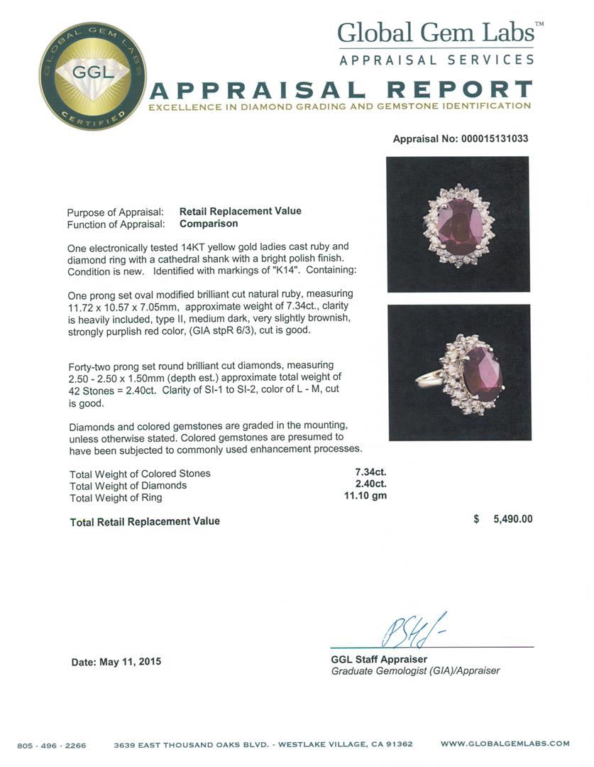 One electronically tested 14KT yellow gold ladies cast ruby and diamond ring with a cathedral shank with a bright polish finish. Identified with markings of "K14". Condition is new. Containing: One prong set oval modified brilliant cut natural ruby, measuring 11.72 x 10.57 x 7.05mm, approximate weight of 7.34ct., clarity is heavily included, type II, medium dark, very slightly brownish, strongly purplish red color, (GIA stpR 6/3), cut is good. Forty-Two prong set round brilliant cut diamonds, measuring 2.50 - 2.50 x 1.50mm (depth est.) approximate total weight of 42 Stones = 2.40ct. Clarity: SI-1 to SI-2. Color: L - M, Cut is Good. Diamonds and colored gemstones are graded in the mounting, unless otherwise stated. Colored gemstones are presumed to have been subjected to commonly used enhancement processes. Total Weight of Colored Stones 7.34ct. Total Weight of Diamonds 2.40ct. Total Weight of Ring 11.10 grams. GGL Appraised at $5,490.00.