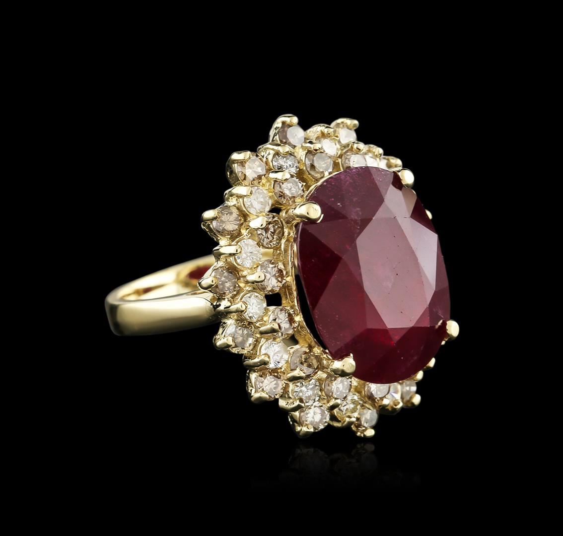 One electronically tested 14KT yellow gold ladies cast ruby and diamond ring with a cathedral shank with a bright polish finish. Identified with markings of "K14". Condition is new. Containing: One prong set oval modified brilliant cut natural ruby, measuring 11.72 x 10.57 x 7.05mm, approximate weight of 7.34ct., clarity is heavily included, type II, medium dark, very slightly brownish, strongly purplish red color, (GIA stpR 6/3), cut is good. Forty-Two prong set round brilliant cut diamonds, measuring 2.50 - 2.50 x 1.50mm (depth est.) approximate total weight of 42 Stones = 2.40ct. Clarity: SI-1 to SI-2. Color: L - M, Cut is Good. Diamonds and colored gemstones are graded in the mounting, unless otherwise stated. Colored gemstones are presumed to have been subjected to commonly used enhancement processes. Total Weight of Colored Stones 7.34ct. Total Weight of Diamonds 2.40ct. Total Weight of Ring 11.10 grams. GGL Appraised at $5,490.00.
