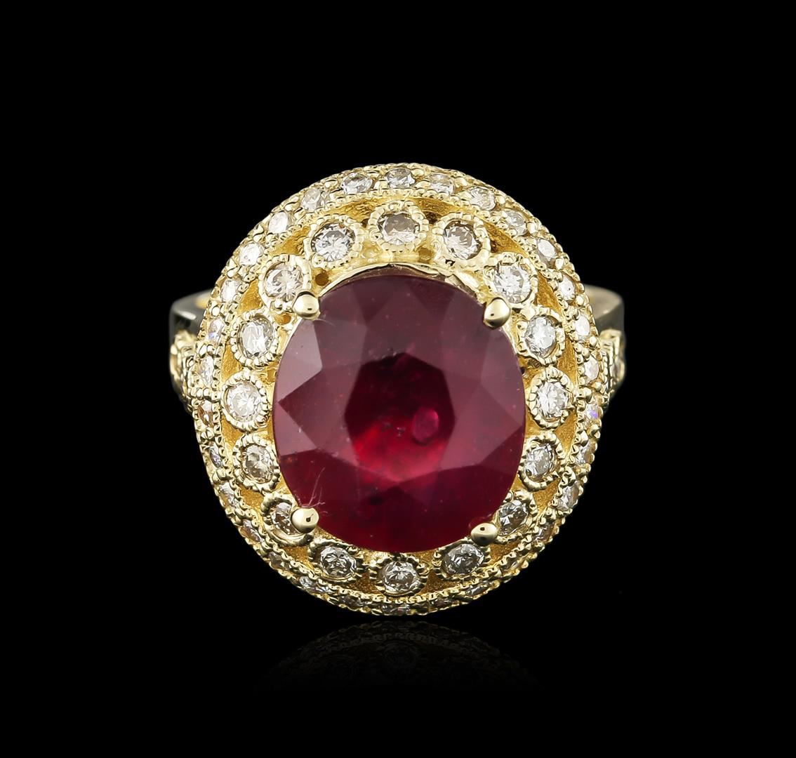 One electronically tested 14KT yellow gold ladies cast ruby and diamond ring with a cathedral shank with a bright polish finish. Identified with markings of "K14". Condition is new. Containing: One prong set oval modified brilliant cut natural ruby, measuring 11.72 x 10.57 x 7.05mm, approximate weight of 7.34ct., clarity is heavily included, type II, medium dark, very slightly brownish, strongly purplish red color, (GIA stpR 6/3), cut is good. Fifty-Two prong set round brilliant cut diamonds, measuring 1.80 - 1.50 x 0.99mm (depth est.) approximate total weight of 52 Stones = 0.85ct. Clarity: SI-1 to SI-2. Color: K - L, Cut is Good. Diamonds and colored gemstones are graded in the mounting, unless otherwise stated. Colored gemstones are presumed to have been subjected to commonly used enhancement processes. Total Weight of Colored Stones 7.34ct. Total Weight of Diamonds 0.85ct. Total Weight of Ring 8.70 grams. GGL Appraised at $3,570.00.