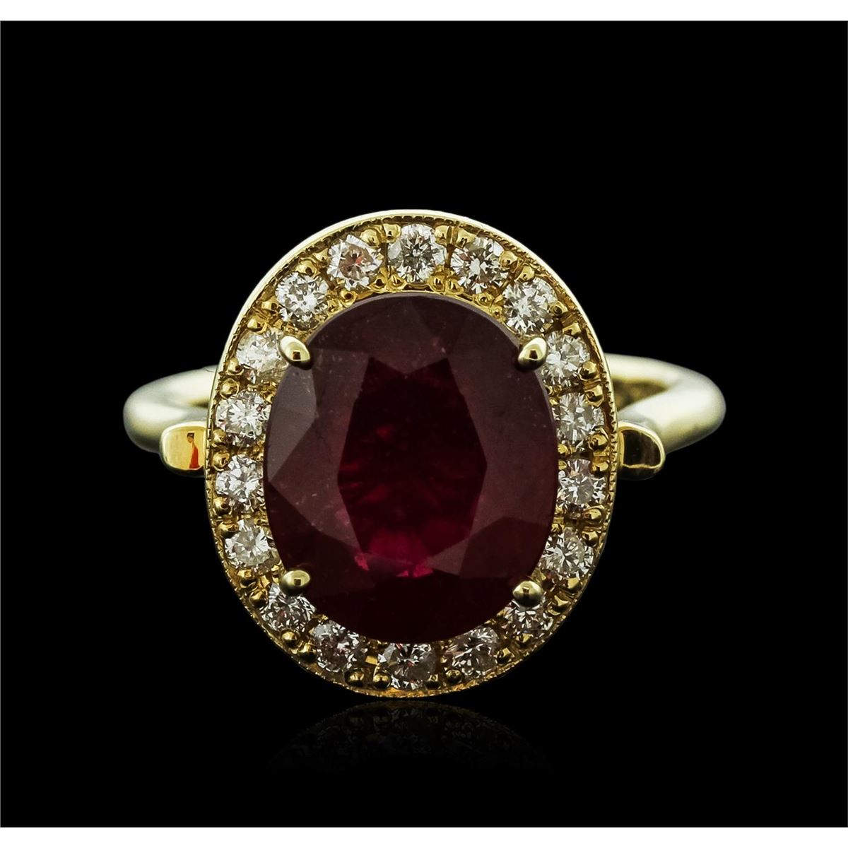 One electronically tested 14KT yellow gold ladies cast ruby and diamond ring with a bright polish finish. Identified with markings of "K14". Condition is new. Containing: One prong set oval modified brilliant cut natural ruby, measuring 12.00 x 10.00 x 7.20mm, approximate weight of 7.35ct., clarity is heavily included, type II, medium dark, very slightly brownish, strongly purplish red color, (GIA stpR 6/3), cut is good. Eighteen prong set round brilliant cut diamonds, measuring 2.00 - 2.00 x 1.20mm (depth est.) approximate total weight of 18 Stones = 0.53ct. Clarity: SI-1 to I-1. Color: I - J, Cut is Good. Colored gemstones are presumed to have been subjected to commonly used enhancement processes. All diamonds and colored gemstones are graded in the mounting, unless otherwise stated. Total Weight of Colored Stones 7.35ct. Total Weight of Diamonds 0.53ct. Total Weight of Ring 7.10 grams. GGL Appraised at $3,845.00.