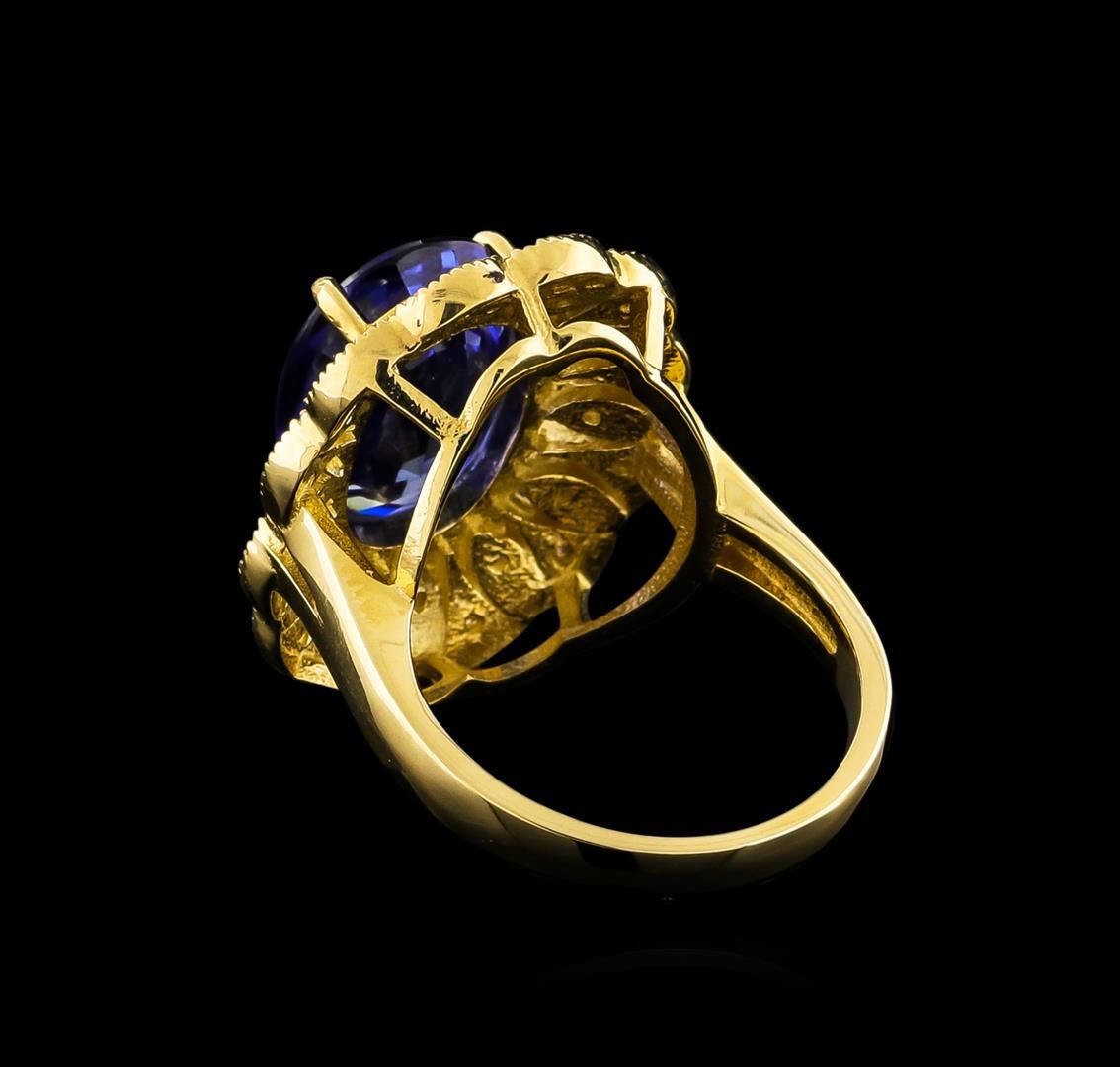 One electronically tested 14KT yellow gold Ladies combination cast & assembled ring with a high polish finish. Condition is new. Identified with markings of "K14". Containing: One prong set oval modified mixed cut natural tanzanite, measuring 13.00 x 10.00 x 6.50mm, approximate weight of 7.38ct., clarity is eye clean, type I, medium, moderately strong, bluish violet color, (GIA bV 5/4), cut is very good. Colored gemstones are presumed to have been subjected to commonly used color/clarity enhancement processes. Forty-Eight prong set round brilliant cut diamonds, measuring 1.50 - 1.20 x 0.81mm (depth est.) approximate. Total Weight of 48 Stones = 0.51ct. Clarity: I-1 to I-2. Color: I - J, Cut is Good. Total Weight of Colored Stones 7.38ct. Total Weight of Diamonds 0.51ct. Total Weight of Ring 10.10 grams. GGL Appraised at $9,560.00.