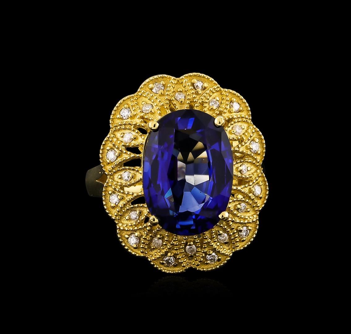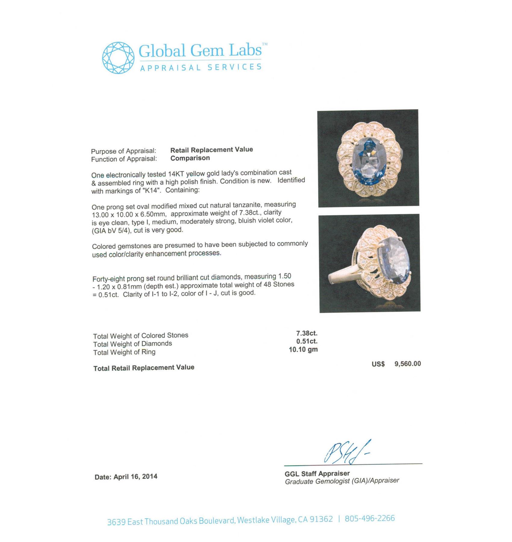 One electronically tested 14KT yellow gold Ladies combination cast & assembled ring with a high polish finish. Condition is new. Identified with markings of "K14". Containing: One prong set oval modified mixed cut natural tanzanite, measuring 13.00 x 10.00 x 6.50mm, approximate weight of 7.38ct., clarity is eye clean, type I, medium, moderately strong, bluish violet color, (GIA bV 5/4), cut is very good. Colored gemstones are presumed to have been subjected to commonly used color/clarity enhancement processes. Forty-Eight prong set round brilliant cut diamonds, measuring 1.50 - 1.20 x 0.81mm (depth est.) approximate. Total Weight of 48 Stones = 0.51ct. Clarity: I-1 to I-2. Color: I - J, Cut is Good. Total Weight of Colored Stones 7.38ct. Total Weight of Diamonds 0.51ct. Total Weight of Ring 10.10 grams. GGL Appraised.