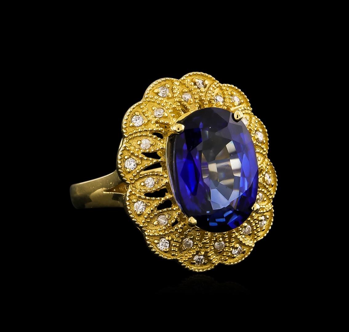 One electronically tested 14KT yellow gold Ladies combination cast & assembled ring with a high polish finish. Condition is new. Identified with markings of "K14". Containing: One prong set oval modified mixed cut natural tanzanite, measuring 13.00 x 10.00 x 6.50mm, approximate weight of 7.38ct., clarity is eye clean, type I, medium, moderately strong, bluish violet color, (GIA bV 5/4), cut is very good. Colored gemstones are presumed to have been subjected to commonly used color/clarity enhancement processes. Forty-Eight prong set round brilliant cut diamonds, measuring 1.50 - 1.20 x 0.81mm (depth est.) approximate. Total Weight of 48 Stones = 0.51ct. Clarity: I-1 to I-2. Color: I - J, Cut is Good. Total Weight of Colored Stones 7.38ct. Total Weight of Diamonds 0.51ct. Total Weight of Ring 10.10 grams. GGL Appraised.