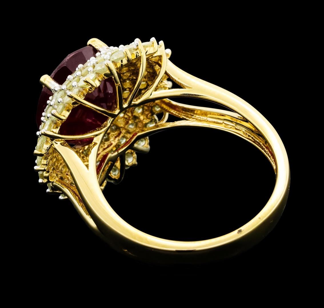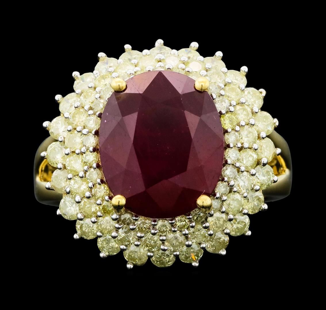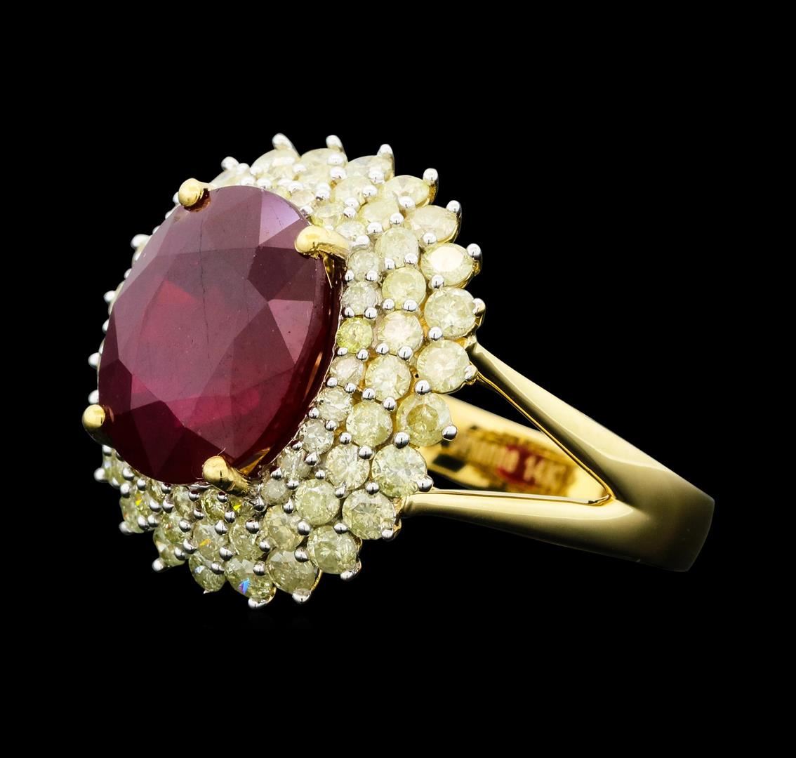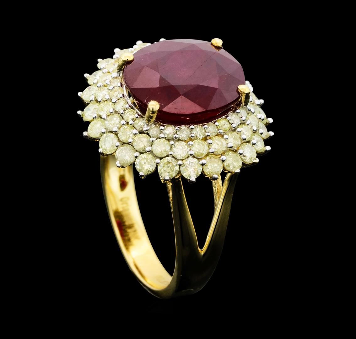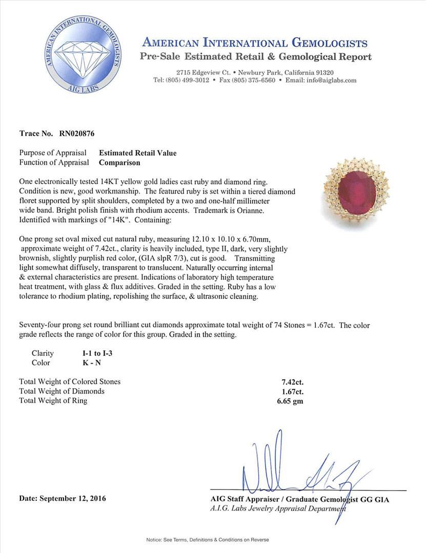One electronically tested 14KT yellow gold ladies cast ruby and diamond ring. The featured ruby is set within a tiered diamond floret supported by split shoulders, completed by a two and one-half millimeter wide band. Bright polish finish with rhodium accents. Trademark is Orianne. Identified with markings of "14K". Condition is new, good workmanship. Containing: One prong set oval mixed cut natural ruby, measuring 12.10 x 10.10 x 6.70mm, approximate weight of 7.42ct., clarity is heavily included, type II, dark, very slightly brownish, slightly purplish red color, (GIA slpR 7/3), cut is good. Transmitting light somewhat diffusely, transparent to translucent. Naturally occurring internal & external characteristics are present. Indications of laboratory high temperature heat treatment, with glass & flux additives. Graded in the setting. Ruby has a low tolerance to rhodium plating, repolishing the surface, & ultrasonic cleaning.Seventy-Four prong set round brilliant cut diamonds approximate total weight of 74 Stones = 1.67ct. The color grade reflects the range of color for this group. Graded in the setting. Clarity: I-1 to I-3. Color: K - N. Total Weight of Colored Stones 7.42ct. Total Weight of Diamonds 1.67ct. Total Weight of Ring 6.65gm. AIG Appraised.