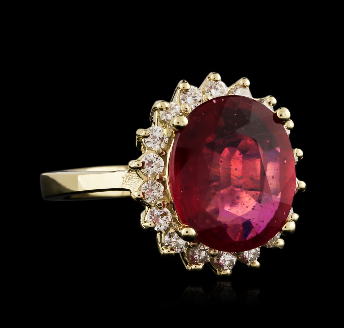 One electronically tested 14KT yellow gold ladies cast ruby and diamond ring with a bright polish finish. Identified with markings of "14K". Condition is new. Containing: One prong set oval modified brilliant cut natural ruby, measuring 12.20 x 10.50 x 6.83mm, approximate weight of 7.44ct., clarity is heavily included, medium light, very slightly brownish, strongly purplish red color, (GIA stpR 4/3), cut is good. Eighteen prong set round brilliant cut diamonds, measuring 1.80 - 1.80 x 1.08mm (depth est.) approximate total weight of 18 Stones = 0.38ct. Clarity: SI-1. Color: J - K, Cut is Good. Colored gemstones are presumed to have been subjected to commonly used enhancement processes. All diamonds and colored gemstones are graded in the mounting, unless otherwise stated. Total Weight of Colored Stones 7.44ct. Total Weight of Diamonds 0.38ct. Total Weight of Ring 6.20 grams. GGL Appraised at $3,250.00.