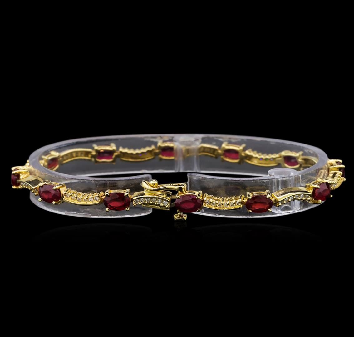 One electronically tested 14KT yellow gold ladies cast ruby and diamond bracelet with a hidden box clasp with safety closer with a bright polish finish. Measurements: 7" in length. Identified with markings of "585". Condition is new. Containing: Twelve prong set oval modified brilliant cut natural rubies, measuring 5.70 x 4.00 x 2.60mm, approximate total weight of 7.45ct., clarity is heavily included, type II, medium dark, very slightly brownish, slightly purplish red color, (GIA slpR 6/3), cut is good. Seventy-Two prong set round brilliant cut diamonds, measuring 1.40 - 1.40 x 0.84mm (depth est.) approximate total weight of 72 Stones = 0.48ct. Clarity: SI-2 to I-2. Color: J - K, Cut is Good. Colored gemstones are presumed to have been subjected to commonly used enhancement processes. All diamonds and colored gemstones are graded in the mounting, unless otherwise stated. Total Weight of Colored Stones 7.45ct. Total Weight of Diamonds 0.48ct. Total Weight of Bracelet 11.60 grams. GGL Appraised at $3,430.00.