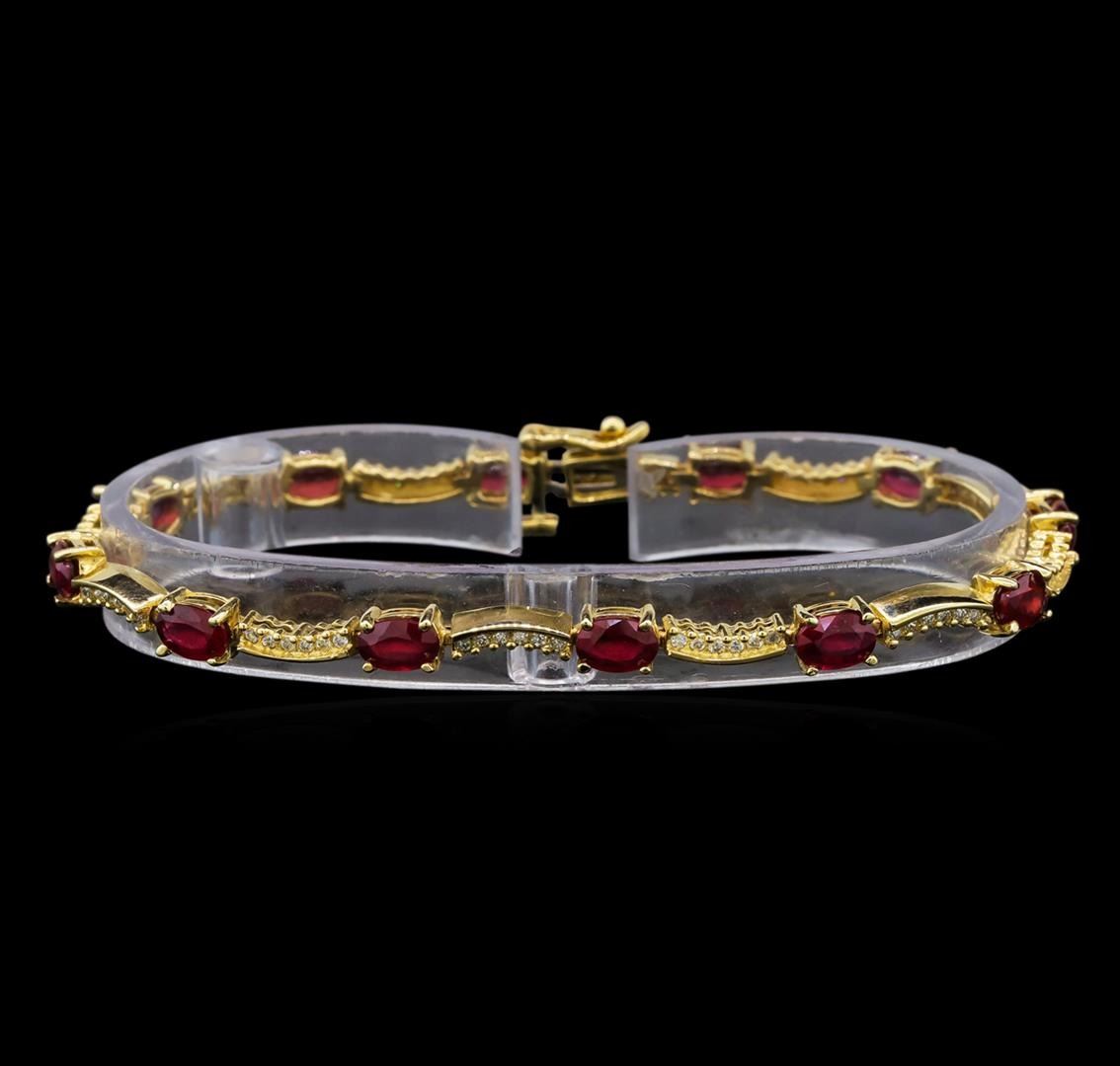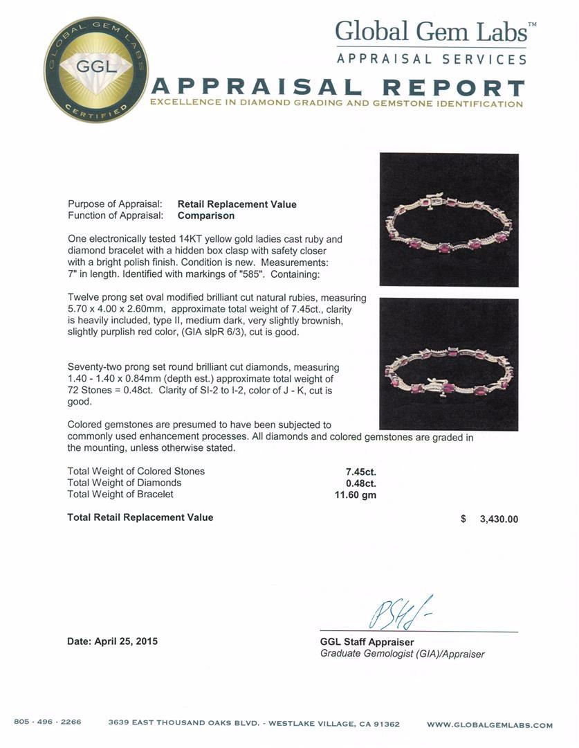 One electronically tested 14KT yellow gold ladies cast ruby and diamond bracelet with a hidden box clasp with safety closer with a bright polish finish. Measurements: 7" in length. Identified with markings of "585". Condition is new. Containing: Twelve prong set oval modified brilliant cut natural rubies, measuring 5.70 x 4.00 x 2.60mm, approximate total weight of 7.45ct., clarity is heavily included, type II, medium dark, very slightly brownish, slightly purplish red color, (GIA slpR 6/3), cut is good. Seventy-Two prong set round brilliant cut diamonds, measuring 1.40 - 1.40 x 0.84mm (depth est.) approximate total weight of 72 Stones = 0.48ct. Clarity: SI-2 to I-2. Color: J - K, Cut is Good. Colored gemstones are presumed to have been subjected to commonly used enhancement processes. All diamonds and colored gemstones are graded in the mounting, unless otherwise stated. Total Weight of Colored Stones 7.45ct. Total Weight of Diamonds 0.48ct. Total Weight of Bracelet 11.60 grams. GGL Appraised at $3,430.00.