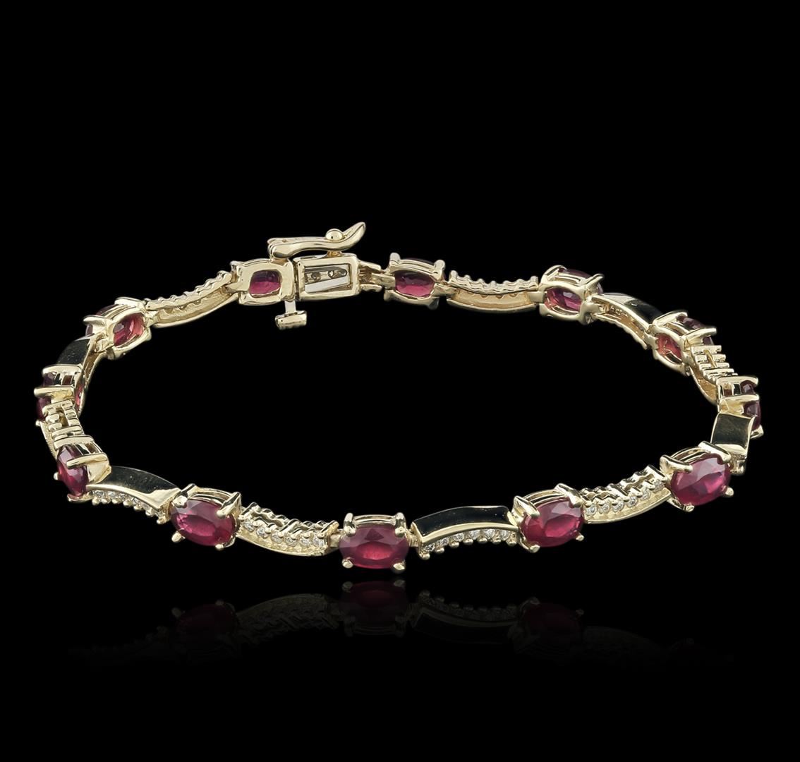 One electronically tested 14KT yellow gold ladies cast ruby and diamond bracelet with a hidden box clasp with safety closer with a bright polish finish. Measurements: 7" in length. Identified with markings of "585". Condition is new. Containing: Twelve prong set oval modified brilliant cut natural rubies, measuring 5.70 x 4.00 x 2.60mm, approximate total weight of 7.45ct., clarity is heavily included, type II, medium dark, very slightly brownish, slightly purplish red color, (GIA slpR 6/3), cut is good. Seventy-Two prong set round brilliant cut diamonds, measuring 1.40 - 1.40 x 0.84mm (depth est.) approximate total weight of 72 Stones = 0.48ct. Clarity: SI-2 to I-2. Color: J - K, Cut is Good. Colored gemstones are presumed to have been subjected to commonly used enhancement processes. All diamonds and colored gemstones are graded in the mounting, unless otherwise stated. Total Weight of Colored Stones 7.45ct. Total Weight of Diamonds 0.48ct. Total Weight of Bracelet 11.60 grams. GGL Appraised at $3,430.00.