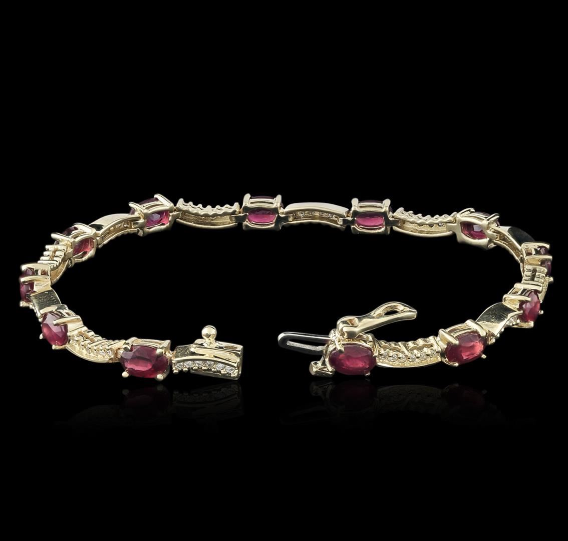 One electronically tested 14KT yellow gold ladies cast ruby and diamond bracelet with a hidden box clasp with safety closer with a bright polish finish. Measurements: 7" in length. Identified with markings of "585". Condition is new. Containing: Twelve prong set oval modified brilliant cut natural rubies, measuring 5.70 x 4.00 x 2.60mm, approximate total weight of 7.45ct., clarity is heavily included, type II, medium dark, very slightly brownish, slightly purplish red color, (GIA slpR 6/3), cut is good. Seventy-Two prong set round brilliant cut diamonds, measuring 1.40 - 1.40 x 0.84mm (depth est.) approximate total weight of 72 Stones = 0.48ct. Clarity: SI-2 to I-2. Color: J - K, Cut is Good. Colored gemstones are presumed to have been subjected to commonly used enhancement processes. All diamonds and colored gemstones are graded in the mounting, unless otherwise stated. Total Weight of Colored Stones 7.45ct. Total Weight of Diamonds 0.48ct. Total Weight of Bracelet 11.60 grams. GGL Appraised at $3,430.00.