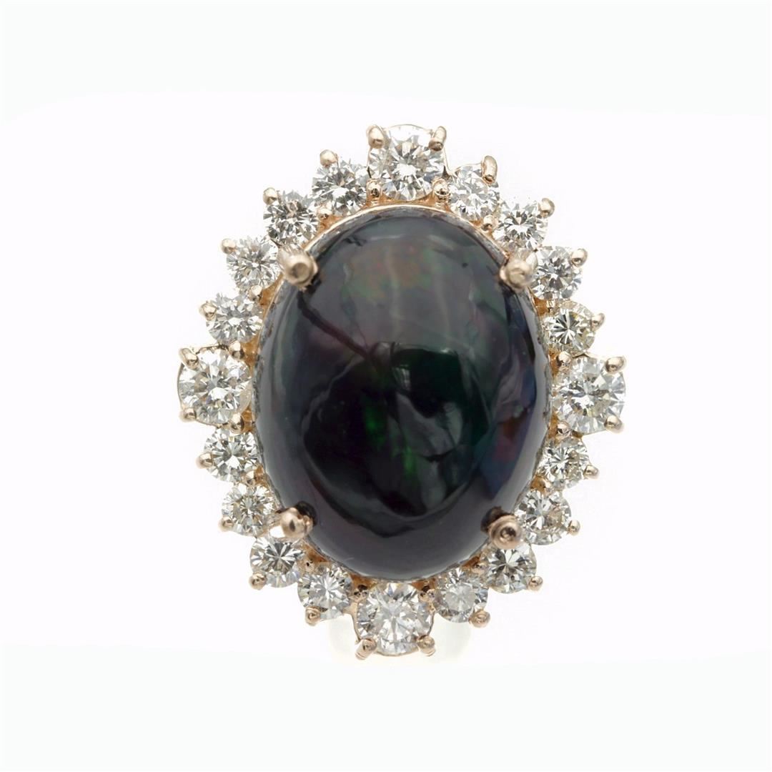 One Natural Diamond and Opal Anniversary Ring in 14k Gold. Size 6.75 but can be resized. Ring design is fancy cocktail with a split shank. Four-prong setting with a total gram weight of 8.20g and total carat weight of 7.46 Ct. Ring includes a total of 20 diamonds. Main stone is natural and non-enhanced. Main stone shape is opal, 6.09 ct,, fine dark clarity, and green opal color. Height of opal is 15.80 mm and width is 12.60 mm, with excellent cut. Side stone is natural and not enhanced, totaling 1.37 Ct. Diamond color is G, clarity VS2-SI1, shape is round cut, and cut is excellent.
