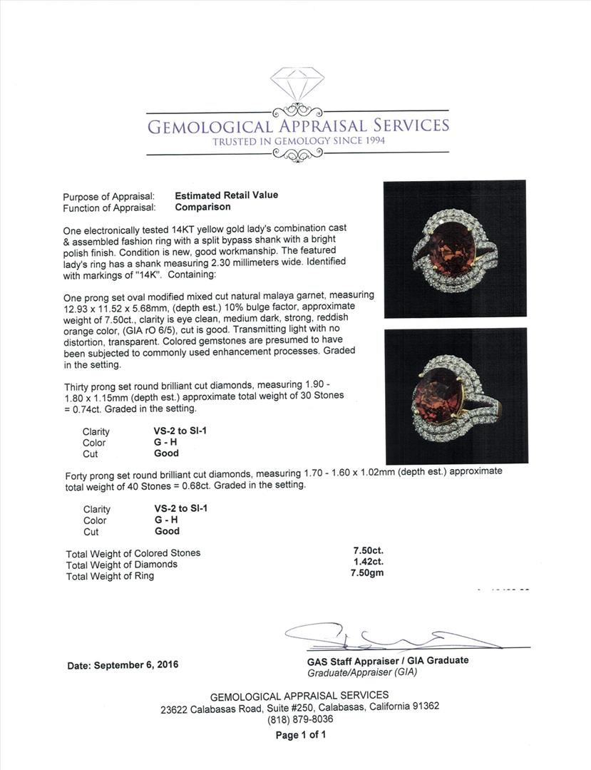 One electronically tested 14KT yellow gold lady's combination cast & assembled fashion ring with a split bypass shank with a bright polish finish. The featured lady's ring has a shank measuring 2.30 millimeters wide. Identified with markings of "14K". Condition is new, good workmanship. Containing: One prong set oval modified mixed cut natural malaya garnet, measuring 12.93 x 11.52 x 5.68mm, (depth est.) 10%. bulge factor, approximate weight of 7.50ct., clarity is eye clean, medium dark, strong, reddish orange color, (GIA rO 6/5), cut is good. Transmitting light with no distortion, transparent. Colored gemstones are presumed to have been subjected to commonly used enhancement processes. Graded in the setting.Thirty prong set round brilliant cut diamonds, measuring 1.90 - 1.80 x 1.15mm (depth est.) approximate total weight of 30 Stones = 0.74ct. Graded in the setting. Clarity: VS-2 to SI-1. Color: G - HCut Good Forty prong set round brilliant cut diamonds, measuring 1.70 - 1.60 x 1.02mm (depth est.) approximate total weight of 40 Stones = 0.68ct. Graded in the setting. Clarity: VS-2 to SI-1. Color: G - HCut Good. Total Weight of Colored Stones 7.50ct. Total Weight of Diamonds 1.42ct. Total Weight of Ring 7.50gm. GAS Appraised.