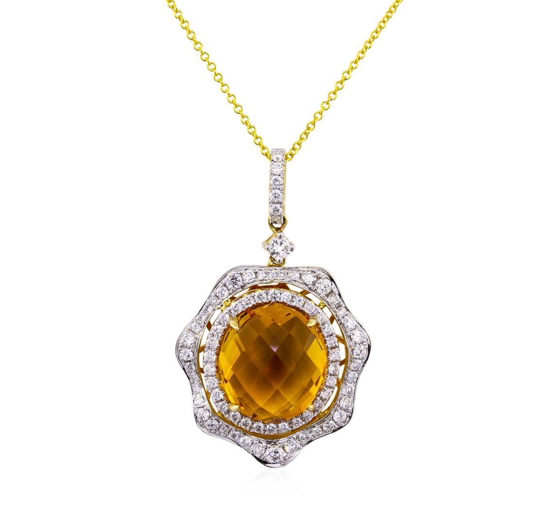 One citrine and diamond pendant with chain necklace set in 5.00 grams of 14KT yellow Gold. This elegant necklace features a 7.56 carat center stone of citrine beautifully showcased by seventy-seven round diamonds weighing 0.91 carats.