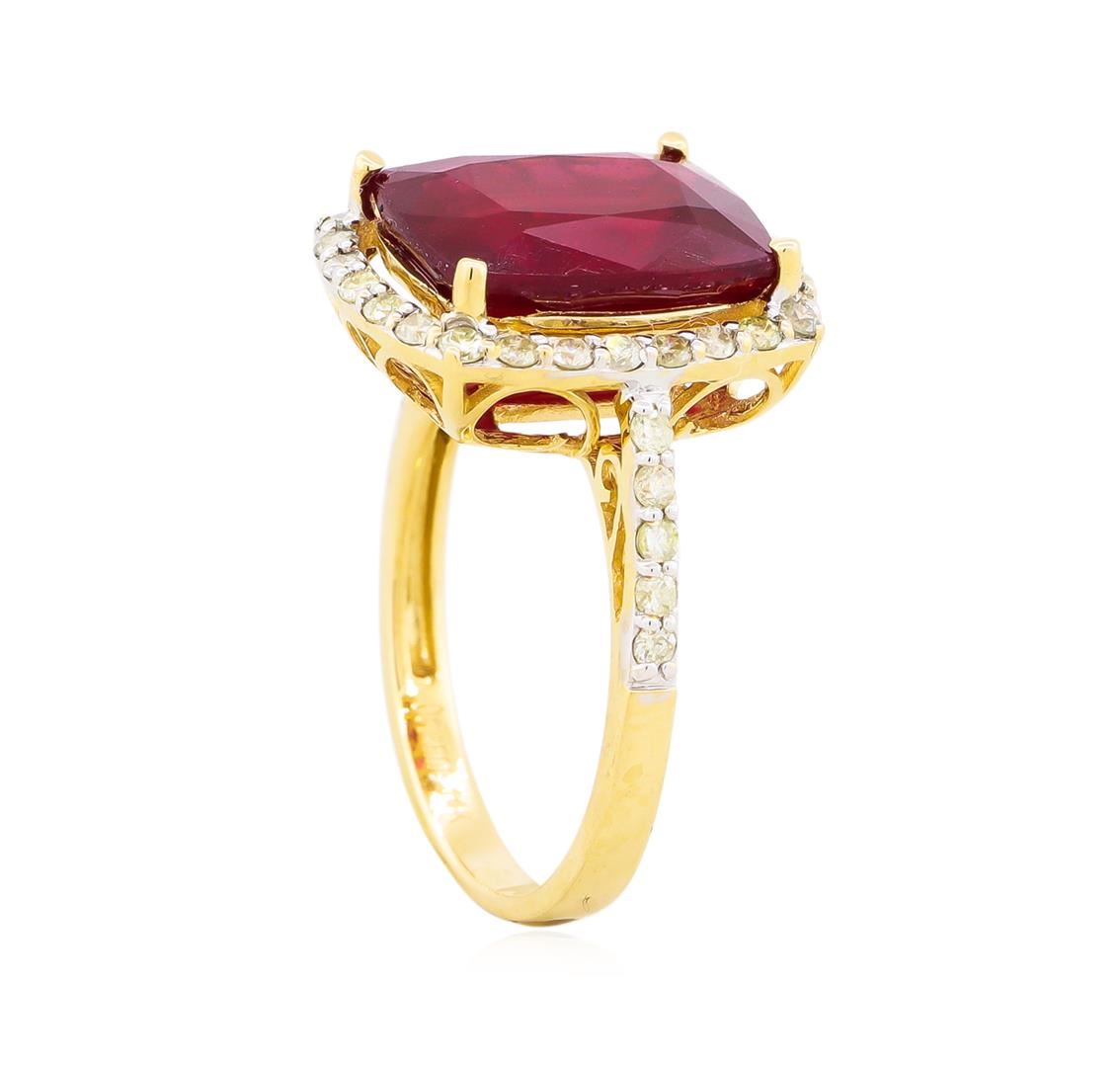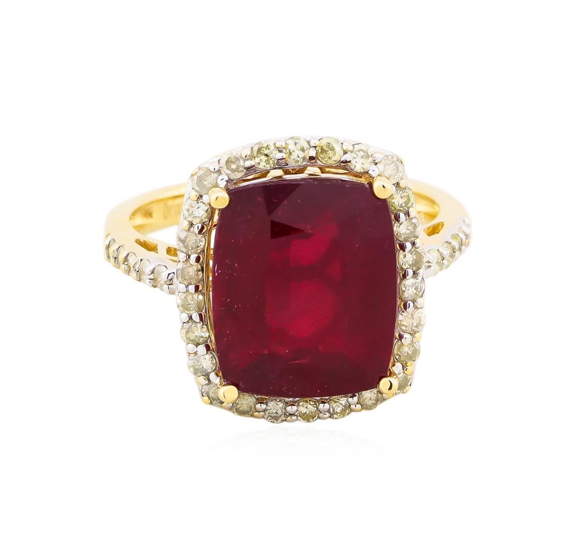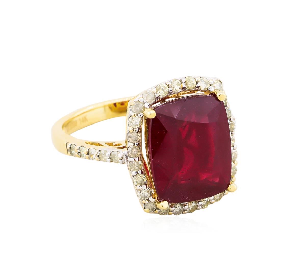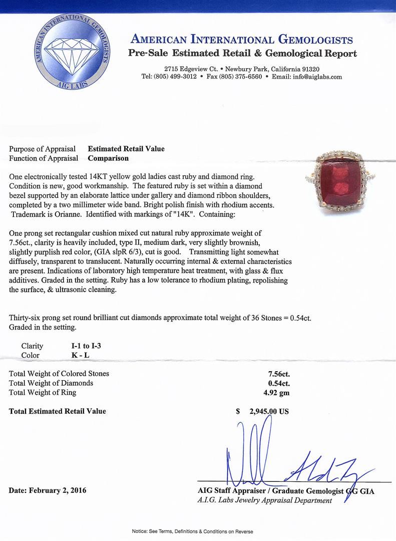 One electronically tested 14KT yellow gold ladies cast ruby and diamond ring. The featured ruby is set within a diamond bezel supported by an elaborate lattice under gallery and diamond ribbon shoulders, completed by a two millimeter wide band. Bright polish finish with rhodium accents. Trademark is Orianne. Identified with markings of "14K". Condition is new, good workmanship. Containing: One prong set rectangular cushion mixed cut natural ruby approximate weight of 7.56ct., clarity is heavily included, type II, medium dark, very slightly brownish, slightly purplish red color, (GIA slpR 6/3), cut is good. Transmitting light somewhat diffusely, transparent to translucent. Naturally occurring internal & external characteristics are present. Indications of laboratory high temperature heat treatment, with glass & flux additives. Graded in the setting. Ruby has a low tolerance to rhodium plating, repolishing the surface, & ultrasonic cleaning.Thirty-Six prong set round brilliant cut diamonds approximate. Total Weight of 36 Stones = 0.54ct. Graded in the setting. Clarity: I-1 to I-3. Color: K - L. Total Weight of Colored Stones 7.56ct. Total Weight of Diamonds 0.54ct. Total Weight of Ring 4.92gm. AIG Appraised at $2,945.00.