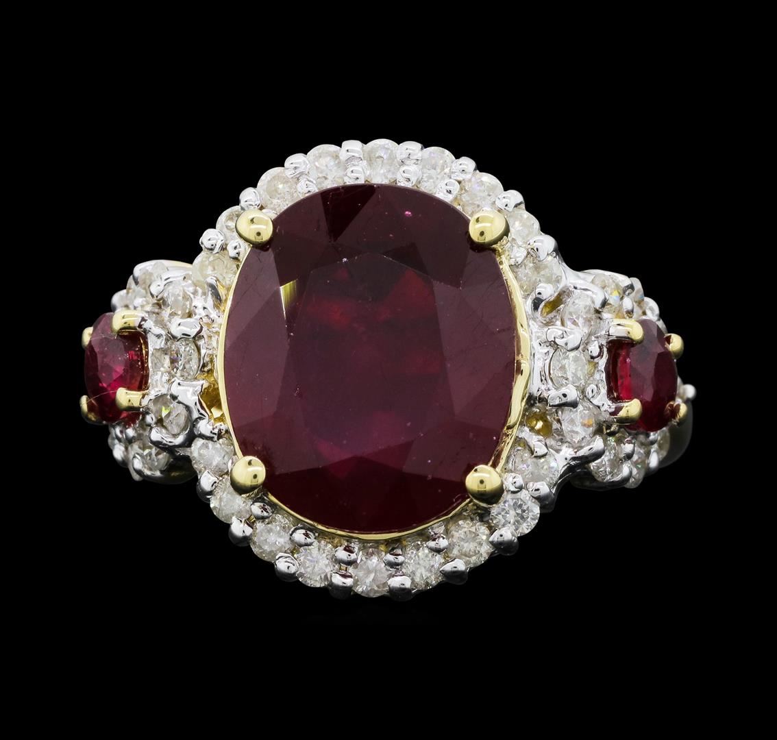 One electronically tested 14KT yellow gold ladies cast ruby and diamond ring. The featured ruby is set within a diamond bezel supported by ruby and diamond floret shoulders, completed by a two millimeter wide band. Bright polish finish with rhodium accents. Identified with markings of "K14". Condition is new, good workmanship. Containing: One prong set oval mixed cut natural ruby, measuring 12.10 x 10.20 x 5.50mm, approximate weight of 6.92ct., clarity is heavily included, type II, medium dark, very slightly brownish, slightly purplish red color, (GIA slept 6/3), cut is good. Transmitting light somewhat diffusely, transparent to translucent. Naturally occurring internal & external characteristics are present. Indications of laboratory high temperature heat treatment, with glass & flux additives. Graded in the setting. Ruby has a low tolerance to rhodium plating, repolishing the surface, & ultrasonic cleaning. Two prong set round mixed cut natural rubies, measuring 4.00 - 4.00 x 2.60 mm, approximate total weight of 0.66ct., clarity is heavily included, type II, medium dark, very slightly brownish, slightly purplish red color, (GIA slept 6/3), cut is good. Transmitting light somewhat diffusely, transparent to translucent. Naturally occurring internal & external characteristics are present. Indications of laboratory high temperature heat treatment, with glass & flux additives. Measurements & the color grade are an average for the pair. Graded in the setting. Ruby has a low tolerance to rhodium plating, repolishing the surface, & ultrasonic cleaning. Forty prong set round brilliant cut diamonds approximate total weight of 40 Stones = 0.78ct. Graded in the setting. Clarity: I-2. Color: F - H. Total Weight of Colored Stones 7.58ct. Total Weight of Diamonds 0.78ct. Total Weight of Ring 9.76gm. AIG Appraised.