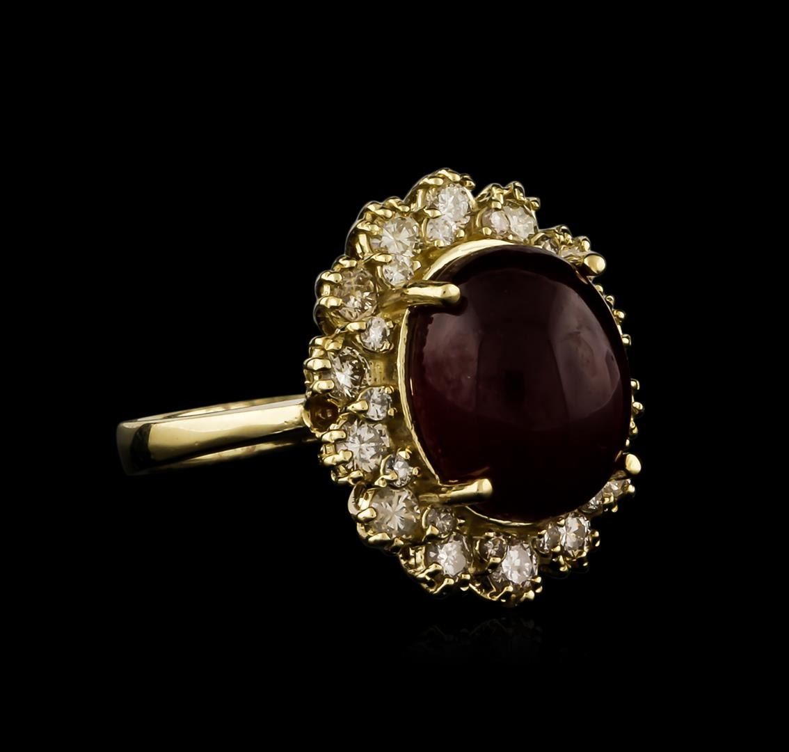 One electronically tested 14KT yellow gold ladies cast ruby and diamond ring with a bright polish finish. Identified with markings of "14K". Condition is new. Containing: One prong set oval cabochon cut natural ruby, measuring 12.50 x 10.00 x 5.64mm, approximate weight of 7.61ct., clarity is heavily included, type II, medium dark, moderately strong, strongly purplish red color, (GIA stpR 6/4), cut is good. Fourteen prong set round brilliant cut diamonds, measuring 2.50 - 2.50 x 1.50mm (depth est.) approximate total weight of 14 Stones = 0.80ct. Clarity: SI-1 to SI-2. Color: J - K, Cut is Good. Fourteen prong set round brilliant cut diamonds, measuring 1.30 - 1.30 x 0.78mm (depth est.) approximate total weight of 14 Stones = 0.11ct. Clarity: SI-1 to SI-2. Color: J - K, Cut is Good. Colored gemstones are presumed to have been subjected to commonly used enhancement processes, All diamonds and colored gemstones are graded in the mounting, unless otherwise stated. Total Weight of Colored Stones 7.61ct. Total Weight of Diamonds 0.91ct. Total Weight of Ring 7.40 grams. GGL Appraised at $4,765.00.