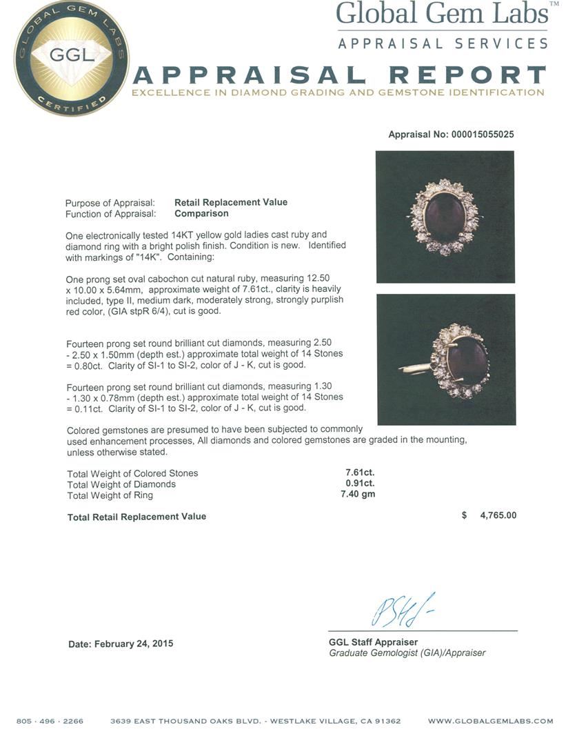 One electronically tested 14KT yellow gold ladies cast ruby and diamond ring with a bright polish finish. Identified with markings of "14K". Condition is new. Containing: One prong set oval cabochon cut natural ruby, measuring 12.50 x 10.00 x 5.64mm, approximate weight of 7.61ct., clarity is heavily included, type II, medium dark, moderately strong, strongly purplish red color, (GIA stpR 6/4), cut is good. Fourteen prong set round brilliant cut diamonds, measuring 2.50 - 2.50 x 1.50mm (depth est.) approximate total weight of 14 Stones = 0.80ct. Clarity: SI-1 to SI-2. Color: J - K, Cut is Good. Fourteen prong set round brilliant cut diamonds, measuring 1.30 - 1.30 x 0.78mm (depth est.) approximate total weight of 14 Stones = 0.11ct. Clarity: SI-1 to SI-2. Color: J - K, Cut is Good. Colored gemstones are presumed to have been subjected to commonly used enhancement processes, All diamonds and colored gemstones are graded in the mounting, unless otherwise stated. Total Weight of Colored Stones 7.61ct. Total Weight of Diamonds 0.91ct. Total Weight of Ring 7.40 grams. GGL Appraised at $4,765.00.