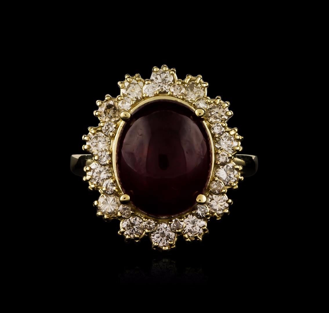 One electronically tested 14KT yellow gold ladies cast ruby and diamond ring with a bright polish finish. Identified with markings of "14K". Condition is new. Containing: One prong set oval cabochon cut natural ruby, measuring 12.50 x 10.00 x 5.64mm, approximate weight of 7.61ct., clarity is heavily included, type II, medium dark, moderately strong, strongly purplish red color, (GIA stpR 6/4), cut is good. Fourteen prong set round brilliant cut diamonds, measuring 2.50 - 2.50 x 1.50mm (depth est.) approximate total weight of 14 Stones = 0.80ct. Clarity: SI-1 to SI-2. Color: J - K, Cut is Good. Fourteen prong set round brilliant cut diamonds, measuring 1.30 - 1.30 x 0.78mm (depth est.) approximate total weight of 14 Stones = 0.11ct. Clarity: SI-1 to SI-2. Color: J - K, Cut is Good. Colored gemstones are presumed to have been subjected to commonly used enhancement processes, All diamonds and colored gemstones are graded in the mounting, unless otherwise stated. Total Weight of Colored Stones 7.61ct. Total Weight of Diamonds 0.91ct. Total Weight of Ring 7.40 grams. GGL Appraised at $4,765.00.