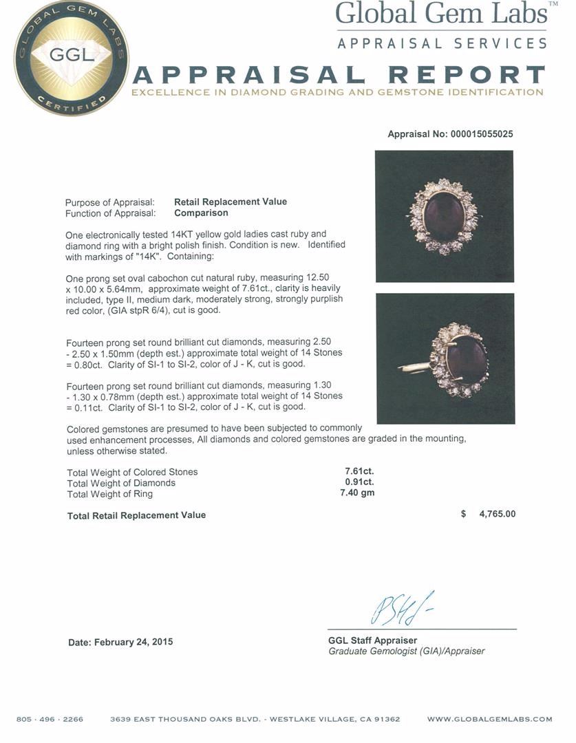 One electronically tested 14KT yellow gold ladies cast ruby and diamond ring with a bright polish finish. Identified with markings of "14K". Condition is new. Containing: One prong set oval cabochon cut natural ruby, measuring 12.50 x 10.00 x 5.64mm, approximate weight of 7.61ct., clarity is heavily included, type II, medium dark, moderately strong, strongly purplish red color, (GIA stpR 6/4), cut is good. Fourteen prong set round brilliant cut diamonds, measuring 2.50 - 2.50 x 1.50mm (depth est.) approximate total weight of 14 Stones = 0.80ct. Clarity: SI-1 to SI-2. Color: J - K, Cut is Good. Fourteen prong set round brilliant cut diamonds, measuring 1.30 - 1.30 x 0.78mm (depth est.) approximate total weight of 14 Stones = 0.11ct. Clarity: SI-1 to SI-2. Color: J - K, Cut is Good. Colored gemstones are presumed to have been subjected to commonly used enhancement processes, All diamonds and colored gemstones are graded in the mounting, unless otherwise stated. Total Weight of Colored Stones 7.61ct. Total Weight of Diamonds 0.91ct. Total Weight of Ring 7.40 grams. GGL Appraised at $4,765.00.
