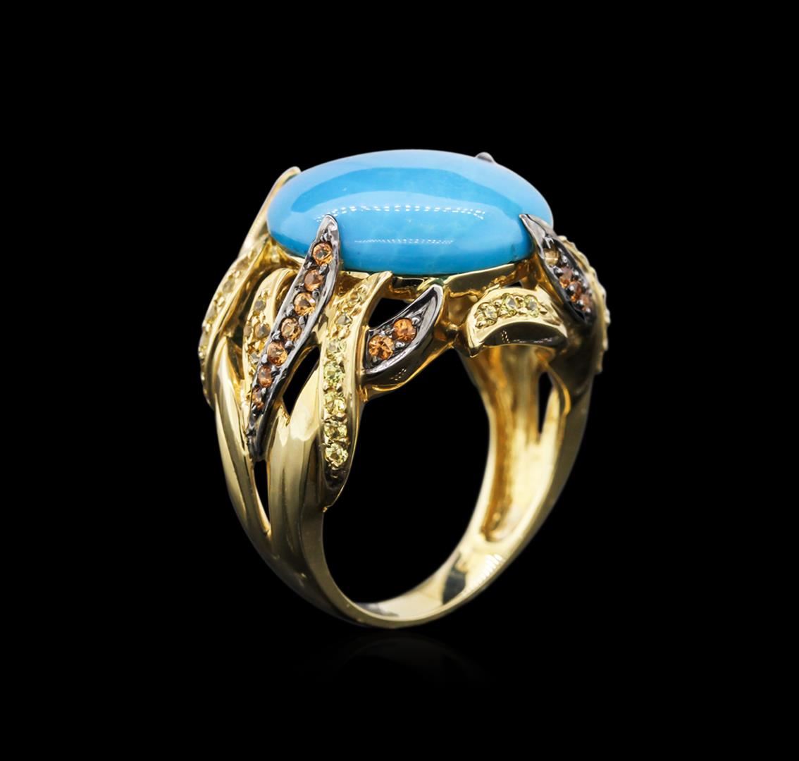 One ring featuring: 14KT yellow gold weighing 6.68 grams containing one turquoise center stone with a total weight of 7.64ct, 40 yellow sapphires with a total weight of 0.46ct and 28 orange sapphires with a total weight of 0.38ct.
