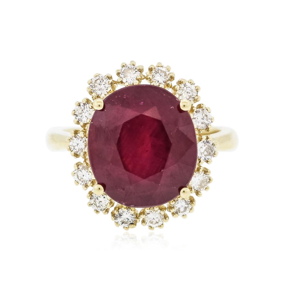 One electronically tested 14KT yellow gold ladies combination cast & assembled ring with a bright polish finish. Identified with markings of "14K". Condition is new. Containing: One prong set oval modified brilliant cut natural ruby, measuring 12.00 x 11.29 x 7.07mm, approximate weight of 7.67ct., clarity is heavily included, type II, medium dark, moderately strong, strongly purplish red color, (GIA stpR 6/4), cut is good. Fourteen prong set round brilliant cut diamonds, measuring 1.90 - 1.90 x 1.14mm (depth est.) approximate total weight of 14 Stones = 0.35ct. Clarity: SI-1 to SI-2. Color: K - L, Cut is Good. Colored gemstones are presumed to have been subjected to commonly used enhancement processes. All diamonds and colored gemstones are graded in the mounting, unless otherwise stated. Total Weight of Colored Stones 7.67ct. Total Weight of Diamonds 0.35ct. Total Weight of Ring 6.60 grams. GGL Appraised at $4,955.00.