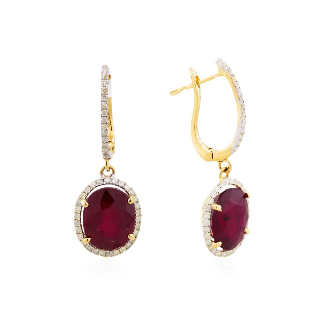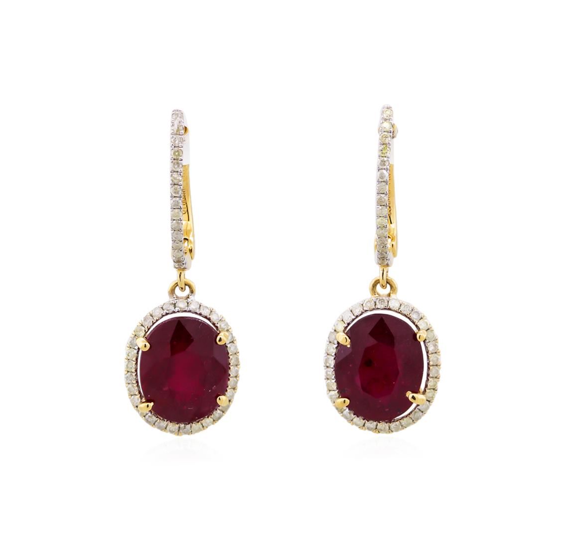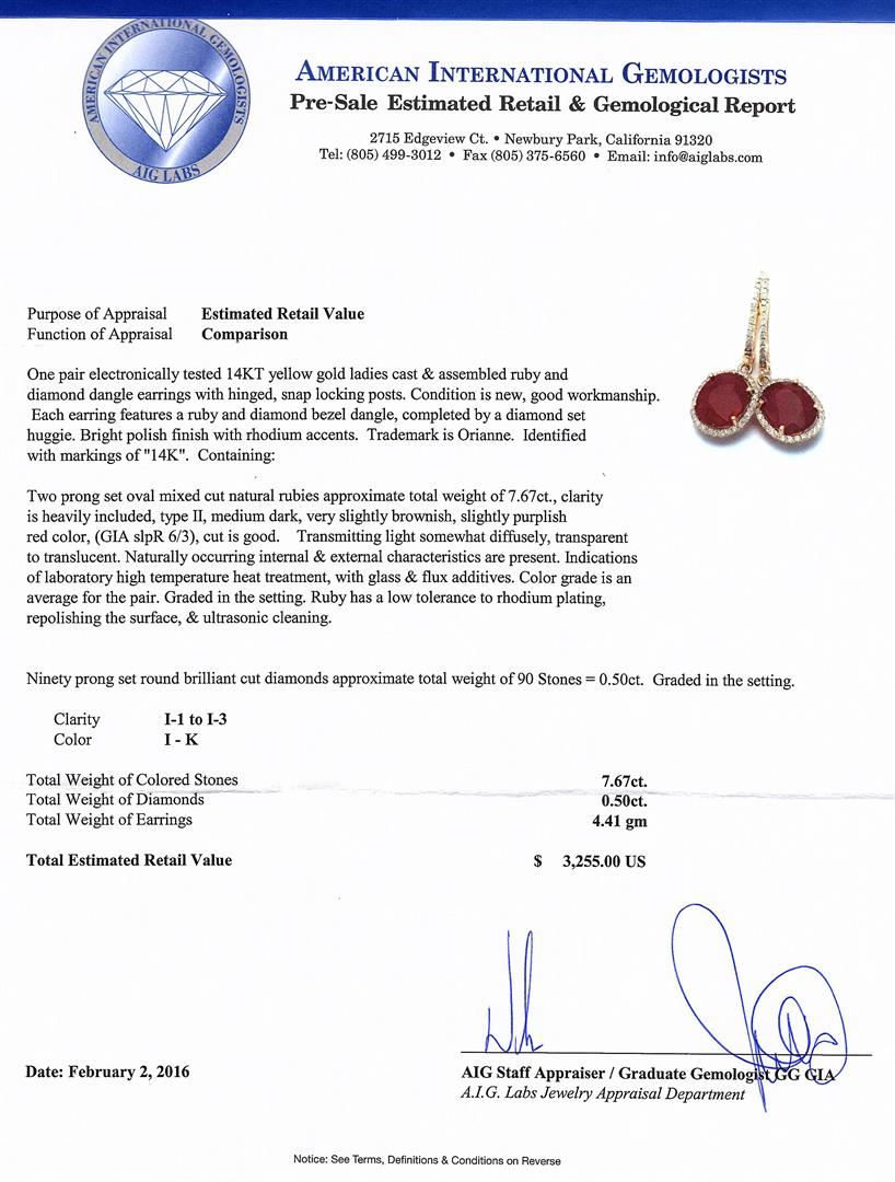 One pair electronically tested 14KT yellow gold ladies cast & assembled ruby and diamond dangle earrings with hinged, snap locking posts. Each earring features a ruby and diamond bezel dangle, completed by a diamond set huggie. Bright polish finish with rhodium accents. Trademark is Orianne. Identified with markings of "14K". Condition is new, good workmanship. Containing: Two prong set oval mixed cut natural rubies approximate. Total Weight of 7.67ct., clarity is heavily included, type II, medium dark, very slightly brownish, slightly purplish red color, (GIA slpR 6/3), cut is good. Transmitting light somewhat diffusely, transparent to translucent. Naturally occurring internal & external characteristics are present. Indications of laboratory high temperature heat treatment, with glass & flux additives. Color grade is anaverage for the pair. Graded in the setting. Ruby has a low tolerance to rhodium plating,repolishing the surface, & ultrasonic cleaning.Ninety prong set round brilliant cut diamonds approximate. Total Weight of 90 Stones = 0.50ct. Graded in the setting. Clarity: I-1 to I-3. Color: I - K. Total Weight of Colored Stones 7.67ct. Total Weight of Diamonds 0.50ct. Total Weight of Earrings 4.41gm. AIG Appraised at $3,255.00.