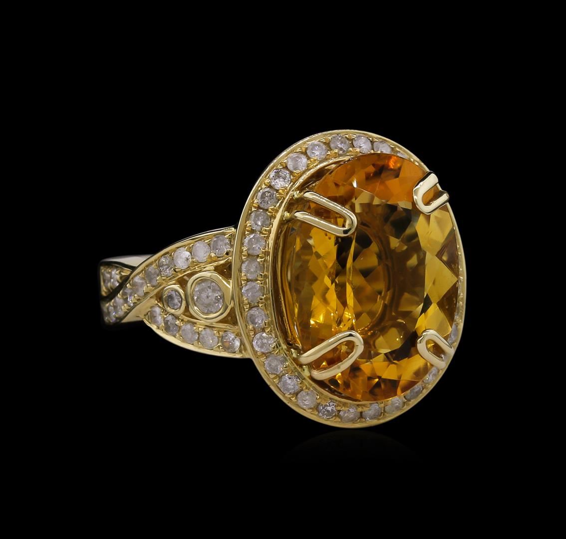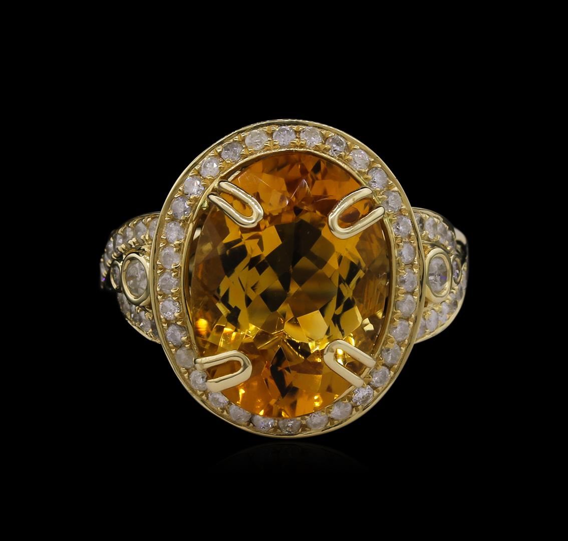 One electronically tested 14KT yellow gold Ladies combination cast & assembled ring with a bright polish finish. Condition is new. Identified with markings of "14K". Containing: One prong set oval modified brilliant cut natural citrine quartz, measuring 16.07 x 11.63 x 7.56mm, approximate weight of 7.71ct., clarity is eye clean, type I, medium light, brownish, orangy yellow color, (GIA oY 4/3), cut is good. Colored gemstones are presumed to have been subjected to commonly used color/clarity enhancement processes. Two bezel set round brilliant cut diamonds, measuring 2.50 - 2.50 x 1.50mm (depth est.) approximate. Total Weight of 2 Stones = 0.11ct. Clarity: I-2 to I-3. Color: I - J, Cut is Good. Thirty-Six prong set round brilliant cut diamonds, measuring 1.50 - 1.50 x 0.90mm (depth est.) approximate. Total Weight of 36 Stones = 0.44ct. Clarity: I-2 to I-3. Color: I - J, Cut is Good. All grading of diamonds and colored gemstones in this piece of jewelry are graded in the mounting, unless otherwise stated. Total Weight of Colored Stones 7.71ct. Total Weight of Diamonds 0.56ct. Total Weight of Ring 9.80 grams. GGL Appraised at $5,010.00.