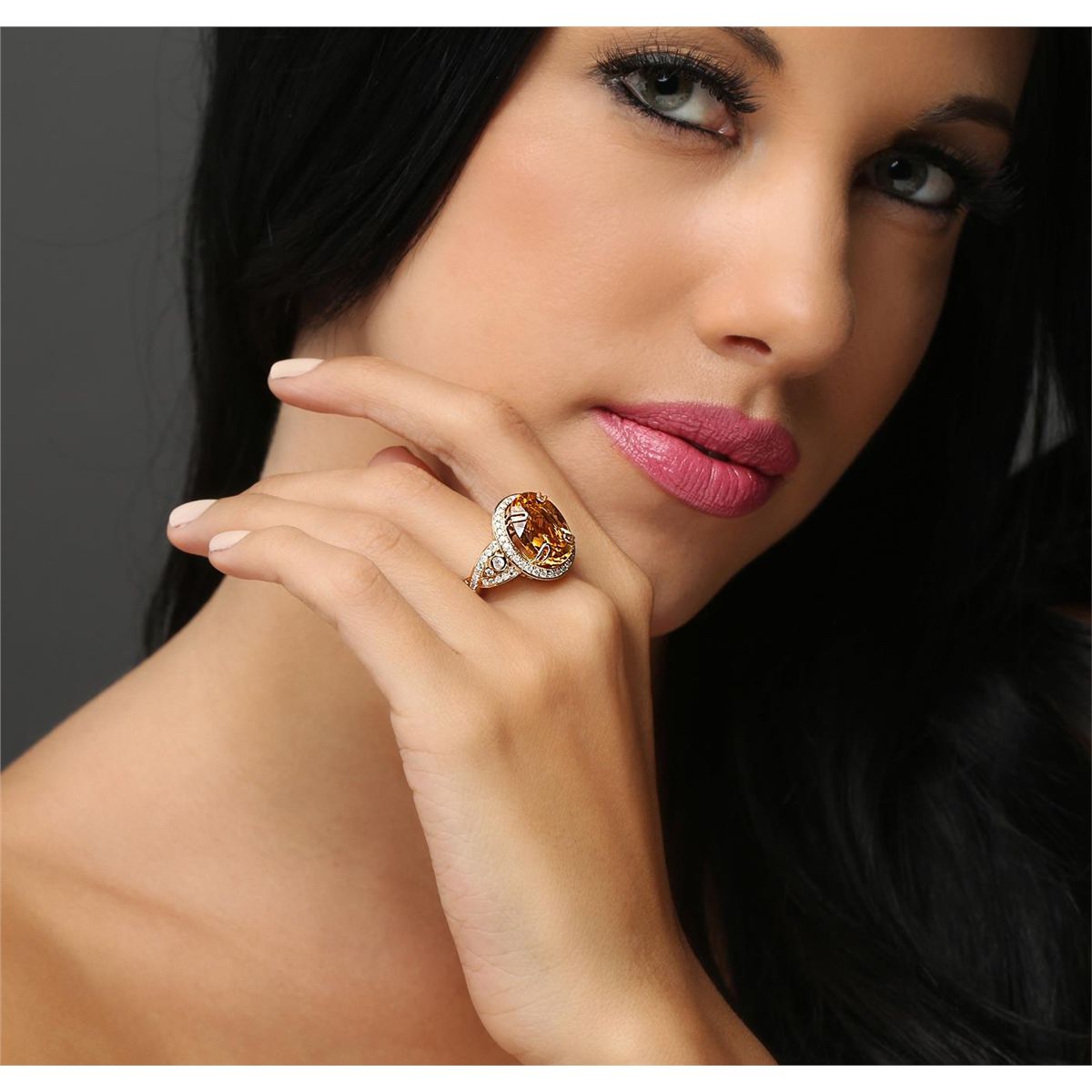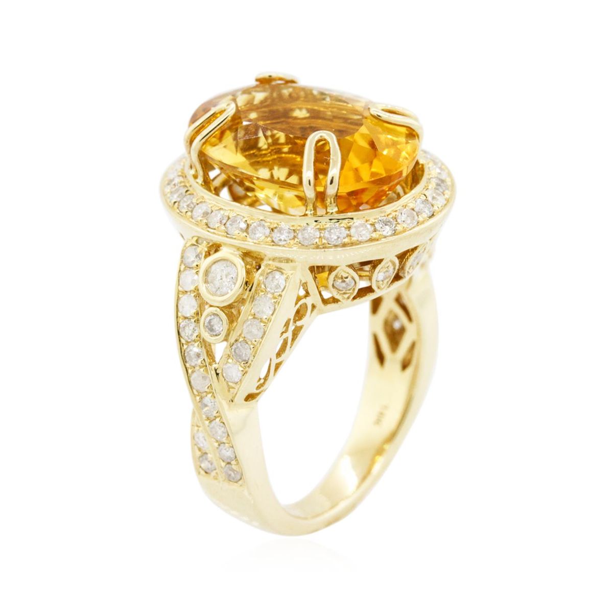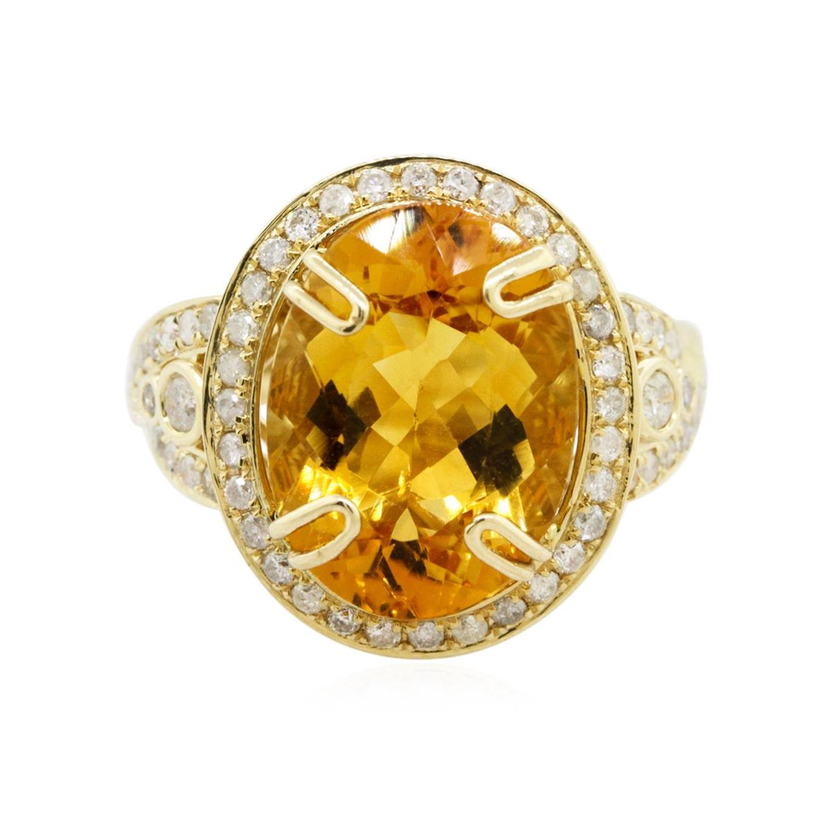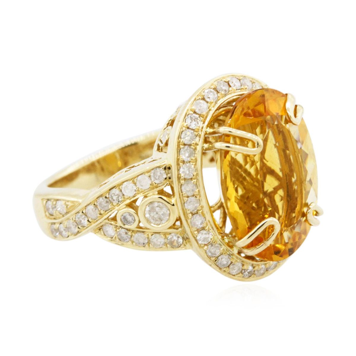 One electronically tested 14KT yellow gold Ladies combination cast & assembled ring with a bright polish finish. Condition is new. Identified with markings of "14K". Containing: One prong set oval modified brilliant cut natural citrine quartz, measuring 16.07 x 11.63 x 7.56mm, approximate weight of 7.71ct., clarity is eye clean, type I, medium light, brownish, orangy yellow color, (GIA oY 4/3), cut is good. Colored gemstones are presumed to have been subjected to commonly used color/clarity enhancement processes. Two bezel set round brilliant cut diamonds, measuring 2.50 - 2.50 x 1.50mm (depth est.) approximate. Total Weight of 2 Stones = 0.11ct. Clarity: I-2 to I-3. Color: I - J, Cut is Good. Thirty-Six prong set round brilliant cut diamonds, measuring 1.50 - 1.50 x 0.90mm (depth est.) approximate. Total Weight of 36 Stones = 0.44ct. Clarity: I-2 to I-3. Color: I - J, Cut is Good. All grading of diamonds and colored gemstones in this piece of jewelry are graded in the mounting, unless otherwise stated. Total Weight of Colored Stones 7.71ct. Total Weight of Diamonds 0.56ct. Total Weight of Ring 9.80 grams. GGL Appraised at $5,010.00.