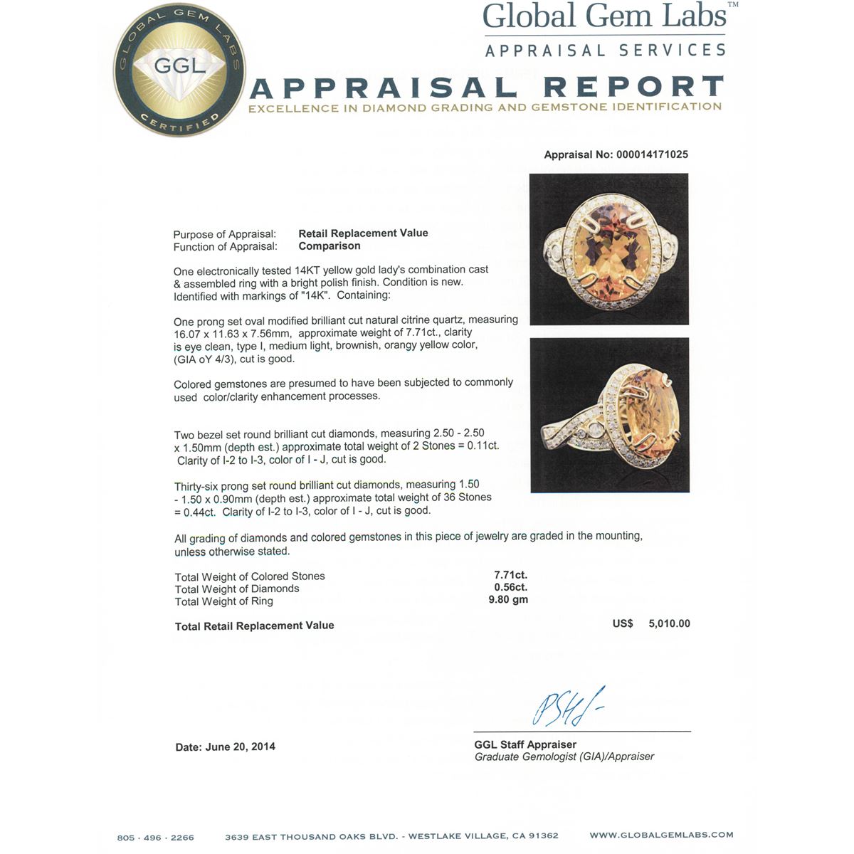 One electronically tested 14KT yellow gold Ladies combination cast & assembled ring with a bright polish finish. Condition is new. Identified with markings of "14K". Containing: One prong set oval modified brilliant cut natural citrine quartz, measuring 16.07 x 11.63 x 7.56mm, approximate weight of 7.71ct., clarity is eye clean, type I, medium light, brownish, orangy yellow color, (GIA oY 4/3), cut is good. Colored gemstones are presumed to have been subjected to commonly used color/clarity enhancement processes. Two bezel set round brilliant cut diamonds, measuring 2.50 - 2.50 x 1.50mm (depth est.) approximate. Total Weight of 2 Stones = 0.11ct. Clarity: I-2 to I-3. Color: I - J, Cut is Good. Thirty-Six prong set round brilliant cut diamonds, measuring 1.50 - 1.50 x 0.90mm (depth est.) approximate. Total Weight of 36 Stones = 0.44ct. Clarity: I-2 to I-3. Color: I - J, Cut is Good. All grading of diamonds and colored gemstones in this piece of jewelry are graded in the mounting, unless otherwise stated. Total Weight of Colored Stones 7.71ct. Total Weight of Diamonds 0.56ct. Total Weight of Ring 9.80 grams. GGL Appraised at $5,010.00.