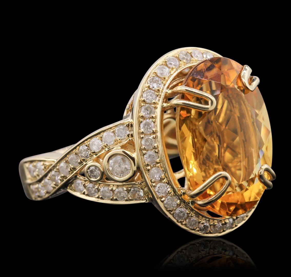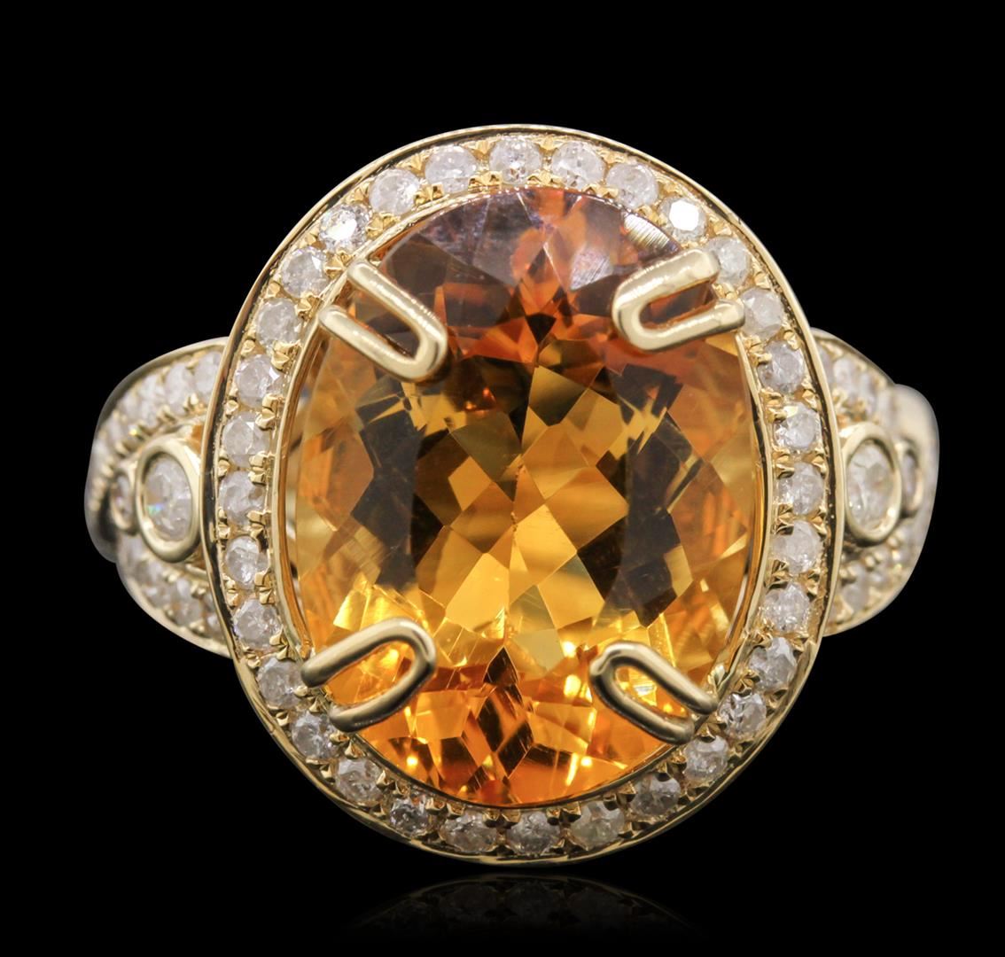 One electronically tested 14KT yellow gold Ladies combination cast & assembled ring with a bright polish finish. Condition is new. Identified with markings of "14K". Containing: One prong set oval modified brilliant cut natural citrine quartz, measuring 16.07 x 11.63 x 7.56mm, approximate weight of 7.71ct., clarity is eye clean, type I, medium light, brownish, orangy yellow color, (GIA oY 4/3), cut is good. Colored gemstones are presumed to have been subjected to commonly used color/clarity enhancement processes. Two bezel set round brilliant cut diamonds, measuring 2.50 - 2.50 x 1.50mm (depth est.) approximate. Total Weight of 2 Stones = 0.11ct. Clarity: I-2 to I-3. Color: I - J, Cut is Good. Thirty-Six prong set round brilliant cut diamonds, measuring 1.50 - 1.50 x 0.90mm (depth est.) approximate. Total Weight of 36 Stones = 0.44ct. Clarity: I-2 to I-3. Color: I - J, Cut is Good. All grading of diamonds and colored gemstones in this piece of jewelry are graded in the mounting, unless otherwise stated. Total Weight of Colored Stones 7.71ct. Total Weight of Diamonds 0.56ct. Total Weight of Ring 9.80 grams. GGL Appraised at $5,010.00.