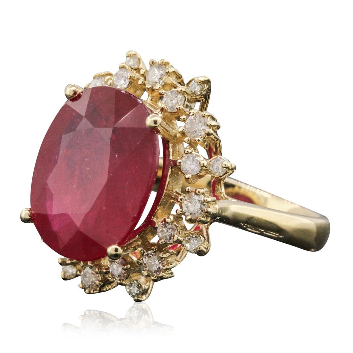 One electronically tested 14KT yellow gold ladies combination cast & assembled ring with a bright polish finish. Condition is new. Identified with markings of "K14". Containing: Twenty-Four prong set round brilliant cut diamonds, measuring 2.00 - 1.40 x 1.02mm (depth est.) approximate. Total Weight of 24 Stones = 0.43ct. Clarity: I-1 to I-2. Color: I - J, Cut is Good. One prong set oval modified brilliant cut natural ruby, measuring 14.40 x 11.19 x 5.90mm, approximate weight of 7.73ct., clarity is heavily included, type II, medium dark, moderately strong, strongly purplish red color, (GIA stpR 6/4), cut is good. Colored gemstones are presumed to have been subjected to commonly used enhancement processes. All diamonds and colored gemstones are graded in the mounting, unless otherwise stated. Total Weight of Colored Stones 7.73ct. Total Weight of Diamonds 0.43ct. Total Weight of Ring 7.90 grams. GGL Appraised at $6,650.00.