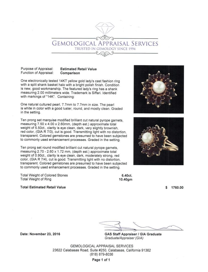 One electronically tested 14KT yellow gold lady's cast fashion ring with a split shank basket halo with a bright polish finish. The featured lady's ring has a shank measuring 2.00 millimeters wide. Trademark is Siffari. Identified with markings of "14K". Condition is new, good workmanship. Containing: One natural cultured pearl, 7.7mm to 7.7mm in size. The pearl is white in color with a good luster, round, and mostly clean. Graded in the setting. Ten prong set marquise modified brilliant cut natural pyrope garnets, measuring 7.50 x 4.00 x 2.60mm, (depth est.) approximate total weight of 5.50ct., clarity is eye clean, dark, very slightly brownish, red color, (GIA R 7/3), cut is good. Transmitting light with no distortion, transparent. Colored gemstones are presumed to have been subjected to commonly used enhancement processes. Graded in the setting. Ten prong set round modified brilliant cut natural pyrope garnets, measuring 2.70 - 2.60 x 1.72 mm, (depth est.) approximate total weight of 0.90ct., clarity is eye clean, dark, moderately strong, red color, (GIA R 7/4), cut is good. Transmitting light with no distortion, transparent. Colored gemstones are presumed to have been subjected to commonly used enhancement processes. Graded in the setting. Total Weight of Colored Stones 6.40ct. Total Weight of Ring 10.40gm. GAS Appraised at $1,760.00.