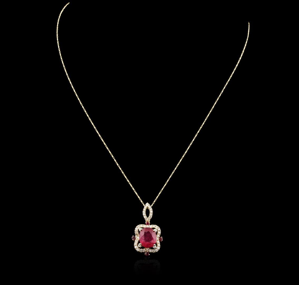 One electronically tested 14KT yellow gold ladies cast ruby and diamond pendant & chain 18.0" long, fancy link with a lobster claw clasp with a bright polish finish. Identified with markings of "14K". Condition is new. Containing: One prong set oval modified brilliant cut natural ruby, measuring 12.49 x 10.54 x 6.85mm, approximate weight of 7.67ct., clarity is heavily included, medium, moderately strong, strongly purplish red color, (GIA stpR 5/4), cut is good. Four prong set round modified brilliant cut natural rubies, measuring 2.30 - 2.30 x 1.50 mm, approximate total weight of 0.24ct., clarity is heavily included, medium, moderately strong, strongly purplish red color, (GIA stpR 5/4), cut is good. Forty-Five prong set round brilliant cut diamonds, measuring 1.60 - 1.60 x 0.96mm (depth est.) approximate total weight of 45 Stones = 0.67ct. Clarity: SI-1 to SI-2. Color: L - M, Cut is Good. Colored gemstones are presumed to have been subjected to commonly used enhancement processes. All diamonds and colored gemstones are graded in the mounting, unless otherwise stated. Total Weight of Colored Stones 7.91ct. Total Weight of Diamonds 0.67ct. Total Weight of Pendant & Chain 8.60 grams. GGL Appraised at $3,590.00.