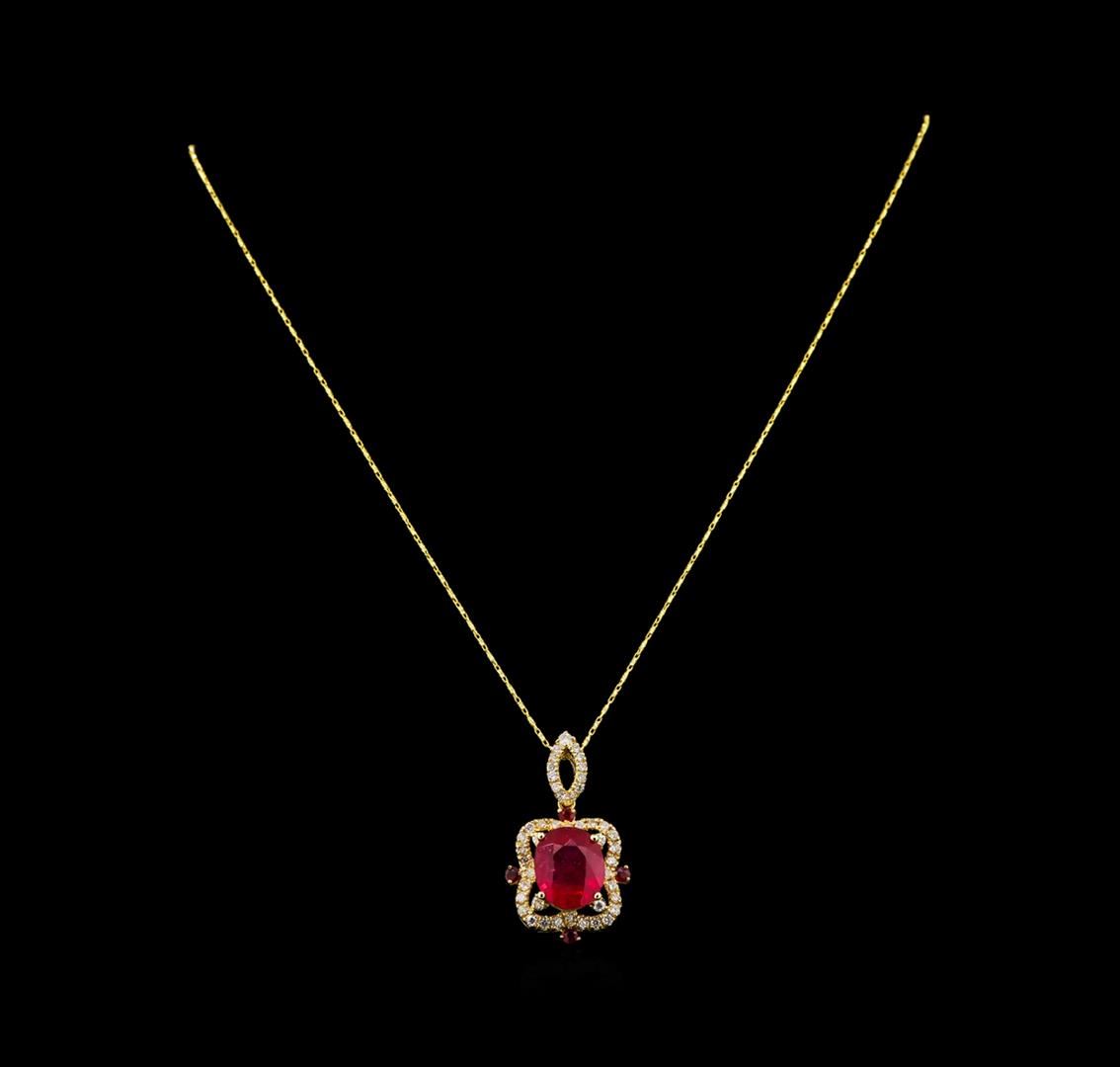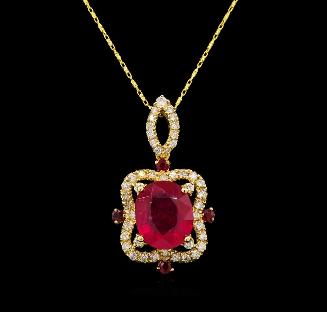 One electronically tested 14KT yellow gold ladies cast ruby and diamond pendant & chain 18.0" long, fancy link with a lobster claw clasp with a bright polish finish. Identified with markings of "14K". Condition is new. Containing: One prong set oval modified brilliant cut natural ruby, measuring 12.49 x 10.54 x 6.85mm, approximate weight of 7.67ct., clarity is heavily included, medium, moderately strong, strongly purplish red color, (GIA stpR 5/4), cut is good. Four prong set round modified brilliant cut natural rubies, measuring 2.30 - 2.30 x 1.50 mm, approximate total weight of 0.24ct., clarity is heavily included, medium, moderately strong, strongly purplish red color, (GIA stpR 5/4), cut is good. Forty-Five prong set round brilliant cut diamonds, measuring 1.60 - 1.60 x 0.96mm (depth est.) approximate total weight of 45 Stones = 0.67ct. Clarity: SI-1 to SI-2. Color: L - M, Cut is Good. Colored gemstones are presumed to have been subjected to commonly used enhancement processes. All diamonds and colored gemstones are graded in the mounting, unless otherwise stated. Total Weight of Colored Stones 7.91ct. Total Weight of Diamonds 0.67ct. Total Weight of Pendant & Chain 8.60 grams. GGL Appraised at $3,590.00.