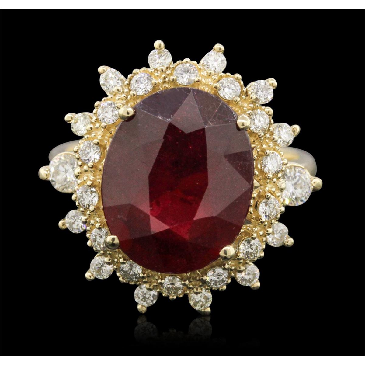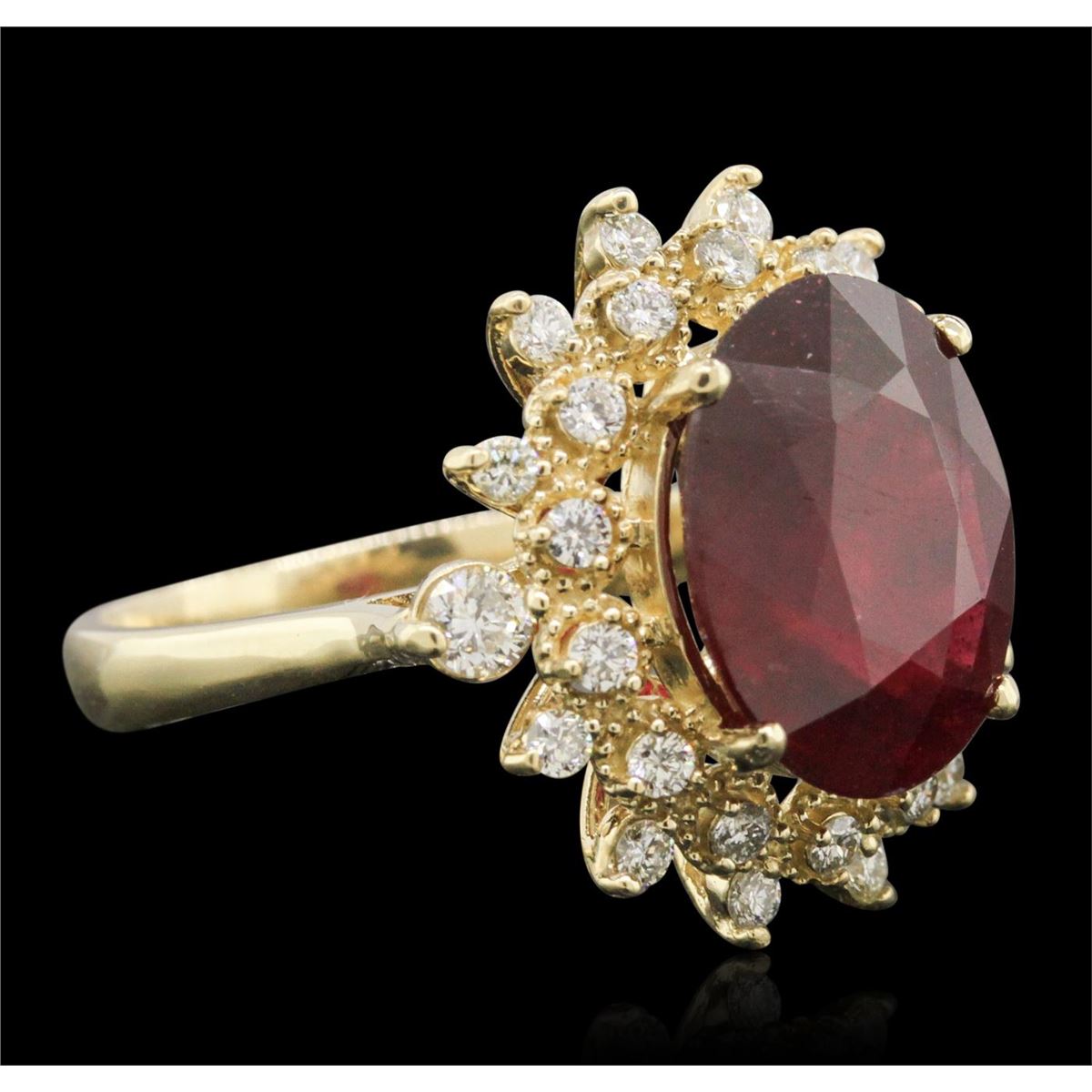 One electronically tested 14KT yellow gold ladies cast ruby and diamond ring. Condition is new, good workmanship. The featured ruby is set within a stylized diamond floret bezel, completed by a three millimeter wide band. Bright polish finish with milgrain detailing. Identified with markings of "K14". Containing: One prong set oval mixed cut natural ruby, measuring 13.50 x 11.00 x 6.00mm, 10%. bulge factor, approximate weight of 7.92ct., clarity is heavily included, type II, dark, very slightly brownish, slightly purplish red color, (GIA slpR 7/3), cut is good. Transmitting light somewhat diffusely, transparent to translucent. Naturally occurring internal & external characteristics are present. Indications of laboratory high temperature heat treatment, with glass & flux additives. Graded in the setting. Ruby has a low tolerance to rhodium plating, repolishing the surface, & ultrasonic cleaning. Two prong set round brilliant cut diamonds, measuring 2.90 - 2.80 x 1.71mm (depth est.) approximate. Total Weight of 2 Stones = 0.20ct. The clarity & color grade reflect the overall average for the pair. Graded in the setting. Clarity: SI-2. Color: H Twenty-Six prong set round brilliant cut diamonds, measuring 1.80 - 1.70 x 1.05mm (depth est.) approximate. Total Weight of 26 Stones = 0.61ct. Graded in the setting. Clarity: VS-1 to SI-1. Color: H - J. Total Weight of Colored Stones 7.92ct. Total Weight of Diamonds 0.81ct. Total Weight of Ring 6.51 grams. AIG Appraised at $5,355.00.