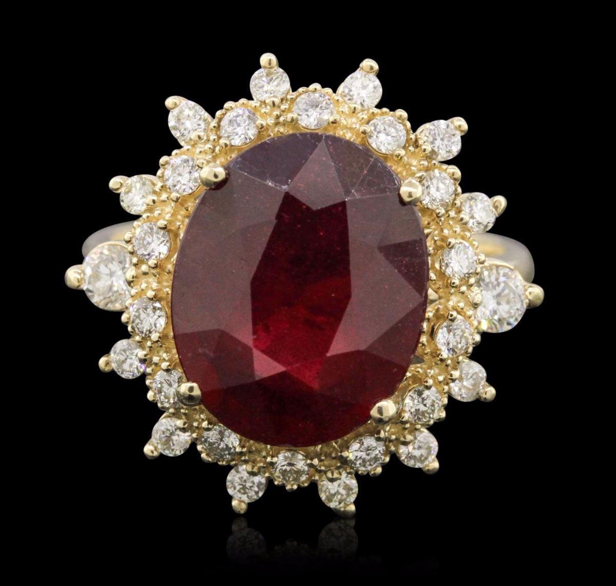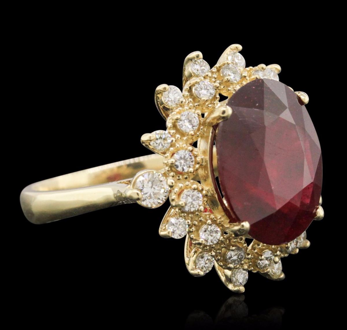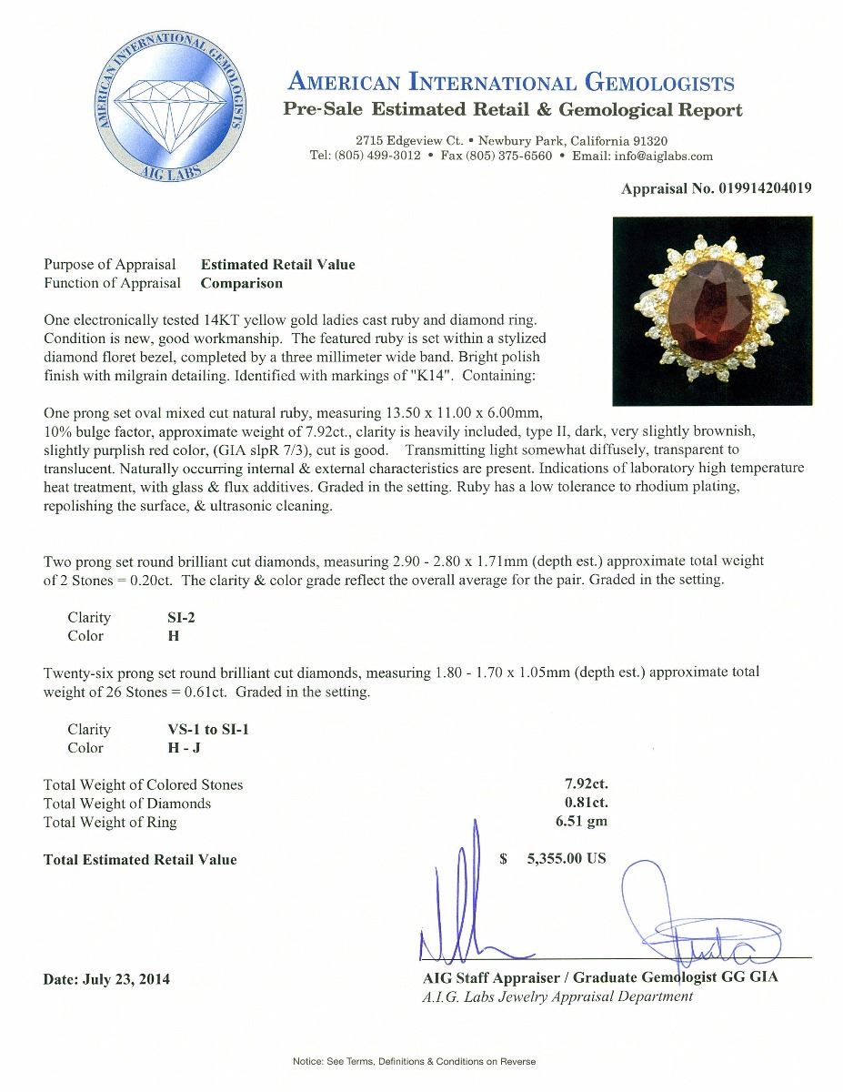 One electronically tested 14KT yellow gold ladies cast ruby and diamond ring. Condition is new, good workmanship. The featured ruby is set within a stylized diamond floret bezel, completed by a three millimeter wide band. Bright polish finish with milgrain detailing. Identified with markings of "K14". Containing: One prong set oval mixed cut natural ruby, measuring 13.50 x 11.00 x 6.00mm, 10%. bulge factor, approximate weight of 7.92ct., clarity is heavily included, type II, dark, very slightly brownish, slightly purplish red color, (GIA slpR 7/3), cut is good. Transmitting light somewhat diffusely, transparent to translucent. Naturally occurring internal & external characteristics are present. Indications of laboratory high temperature heat treatment, with glass & flux additives. Graded in the setting. Ruby has a low tolerance to rhodium plating, repolishing the surface, & ultrasonic cleaning. Two prong set round brilliant cut diamonds, measuring 2.90 - 2.80 x 1.71mm (depth est.) approximate. Total Weight of 2 Stones = 0.20ct. The clarity & color grade reflect the overall average for the pair. Graded in the setting. Clarity: SI-2. Color: H Twenty-Six prong set round brilliant cut diamonds, measuring 1.80 - 1.70 x 1.05mm (depth est.) approximate. Total Weight of 26 Stones = 0.61ct. Graded in the setting. Clarity: VS-1 to SI-1. Color: H - J. Total Weight of Colored Stones 7.92ct. Total Weight of Diamonds 0.81ct. Total Weight of Ring 6.51 grams. AIG Appraised at $5,355.00.