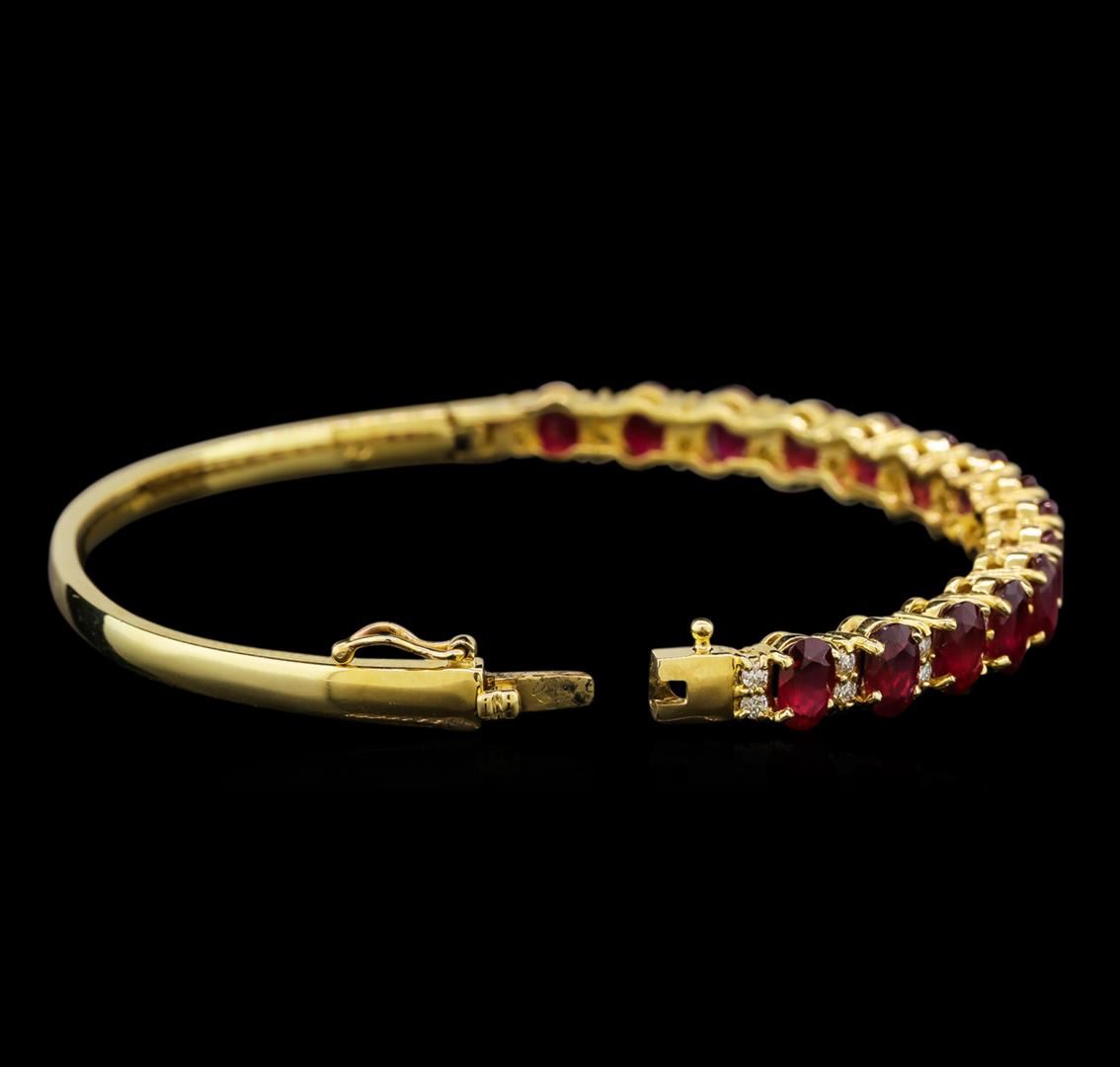 One electronically tested 14KT yellow gold ladies cast ruby and diamond bangle bracelet with a hidden box clasp with safety closer with a bright polish finish. Condition is new. Containing: Fifteen prong set oval modified brilliant cut natural rubies, measuring 6.00 x 4.00 x 2.60mm, approximate total weight of 7.95ct., clarity is heavily included, medium, moderately strong, purple red color, (GIA PR 5/4), cut is good. Thirty-Two prong set round brilliant cut diamonds, measuring 1.30 - 1.30 x 0.78mm (depth est.) approximate total weight of 32 Stones = 0.26ct. Clarity: SI-2 to I-1. Color: J - K, Cut is Good. Colored gemstones are presumed to have been subjected to commonly used enhancement processes. All colored gemstones are graded in the mounting, unless otherwise stated. Total Weight of Colored Stones 7.95ct. Total Weight of Diamonds 0.26ct. Total Weight of Bangle Bracelet 19.30 grams. GGL Appraised at $4,510.00.