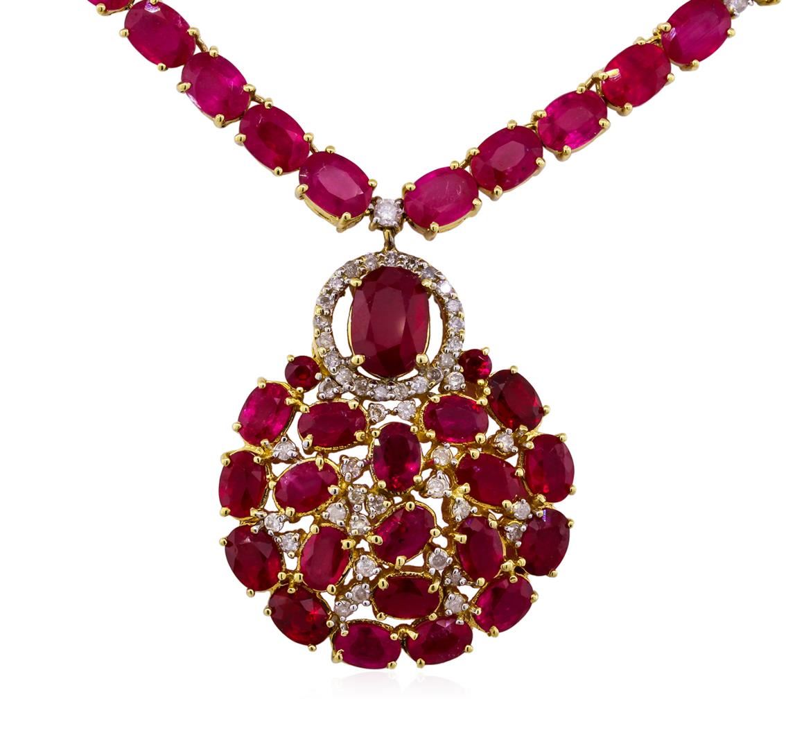 One electronically tested 14KT yellow gold ladies cast & assembled ruby & diamond necklace. Seventeen inch length wearable necklace features a stylized ruby and diamond floret pendant supported by a flexible ruby and diamond ribbon, terminating in a concealed clasp with safety. Bright polish finish with rhodium accents. Identified with markings of "14K". Condition is new, good workmanship. Containing: One prong set oval brilliant cut natural ruby approximate weight of 3.14ct., clarity is heavily included, type II, dark, slightly brownish, slightly purplish red color, (GIA slpR 7/2), cut is good. Transmitting light somewhat diffusely, transparent to translucent. Naturally occurring internal & external characteristics are present. Indications of laboratory high temperature heat treatment, with glass & flux additives. Graded in the setting. Ruby has a low tolerance to rhodium plating, repolishing the surface, & ultrasonic cleaning.Seventy-nine prong set oval mixed cut natural rubies approximate. Total Weight of 67.02ct., clarity is heavily included, type II, dark, very slightly brownish, slightly purplish red color, (GIA slpR 7/3), cut is good. Transmitting light somewhat diffusely, transparent to translucent. Naturally occurring internal & external characteristics are present. Indications of laboratory high temperature heat treatment, with glass & flux additives. Graded in the setting. Ruby has a low tolerance to rhodium plating, repolishing the surface, & ultrasonic cleaning.Fifty-Five prong set round brilliant cut diamonds (depth est.) approximate. Total Weight of 55 Stones = 1.57ct. Graded in the setting. Clarity: I-1 to I-2. Color: F - H. Total Weight of Colored Stones 70.16ct. Total Weight of Diamonds 1.57ct. AIG Appraised at $20,500.00.