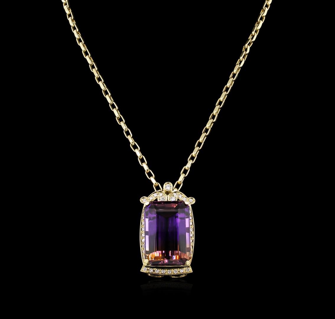 One electronically tested 14KT yellow gold ladies cast & assembled ametrine and diamond pendant with chain. Condition is new, good workmanship. The pendant features an ametrine set within a diamond set frame, completed by a concealed bail. The pendant is supported by an eighteen inch 14KT yellow gold designer style chain, terminating in a lobster claw clasp. Bright polish finish with milgrain detailing. Identified with markings of "14K". Containing: One prong set emerald step cut natural ametrine quartz, measuring 32.00 x 22.00 x 14.20mm, approximate weight of 73.39ct., clarity is eye clean, type I, medium dark, moderately strong, purple color, (GIA P 6/4) to medium, moderately strong, yellowish orange, (GIA y0 5/4), cut is good. Transmitting light with no distortion, transparent. Colored Stone Grading Report attached. Graded in the setting. Ametrine is one of the rarest gemstones in the world. It is actually two gems in one. Ametrine brings together the gold of Citrine and the purple of Amethyst. The unusual color variation found in Ametrine is due to the presence of iron that has oxidized at different states within the same crystal structure. This is a natural process. The world's only known source of Ametrine is the Anahi Mine in Bolivia. The Anahi mine began organized production in the early 1600's by the Spanish Conquistadors. The mine is named after the wife of the first owner, an Ayoreos Tribal Princess named Anahi. The native people of the Ayoreos Tribe inhabit the central plains of South America. Ametrine became popular in the United States about 1980 when material from the Anahi mine in Bolivia began to appear on the market in large quantities. Before 1980 Ametrine was quite unusual and was known as Amethyst-Citrine Quartz, or Golden Amethyst. Ametrine is usually highlighted by cutting the gem into rectangular shapes. Thirty-seven bead & bezel set round brilliant cut diamonds, measuring 3.50 - 2.00 x 1.65mm (depth est.) approximate total weight of 37 Stones = 1.32ct. Graded in the setting. Clarity SI-1 to I-1. Color G -- I. Total Weight of Colored Stones 73.39ct. Total Weight of Diamonds 1.32ct. Total Weight of Pendant With Chain 40.20gm. AIG Appraised at $14,890.00.