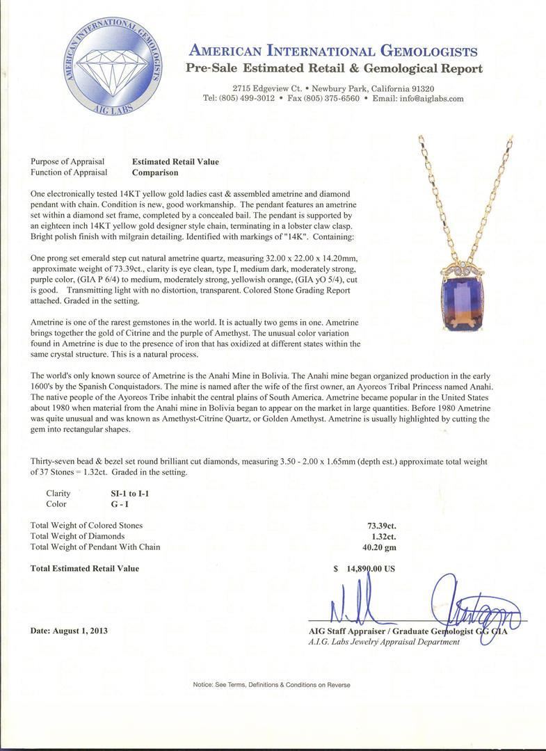 One electronically tested 14KT yellow gold ladies cast & assembled ametrine and diamond pendant with chain. Condition is new, good workmanship. The pendant features an ametrine set within a diamond set frame, completed by a concealed bail. The pendant is supported by an eighteen inch 14KT yellow gold designer style chain, terminating in a lobster claw clasp. Bright polish finish with milgrain detailing. Identified with markings of "14K". Containing: One prong set emerald step cut natural ametrine quartz, measuring 32.00 x 22.00 x 14.20mm, approximate weight of 73.39ct., clarity is eye clean, type I, medium dark, moderately strong, purple color, (GIA P 6/4) to medium, moderately strong, yellowish orange, (GIA y0 5/4), cut is good. Transmitting light with no distortion, transparent. Colored Stone Grading Report attached. Graded in the setting. Ametrine is one of the rarest gemstones in the world. It is actually two gems in one. Ametrine brings together the gold of Citrine and the purple of Amethyst. The unusual color variation found in Ametrine is due to the presence of iron that has oxidized at different states within the same crystal structure. This is a natural process. The world's only known source of Ametrine is the Anahi Mine in Bolivia. The Anahi mine began organized production in the early 1600's by the Spanish Conquistadors. The mine is named after the wife of the first owner, an Ayoreos Tribal Princess named Anahi. The native people of the Ayoreos Tribe inhabit the central plains of South America. Ametrine became popular in the United States about 1980 when material from the Anahi mine in Bolivia began to appear on the market in large quantities. Before 1980 Ametrine was quite unusual and was known as Amethyst-Citrine Quartz, or Golden Amethyst. Ametrine is usually highlighted by cutting the gem into rectangular shapes. Thirty-seven bead & bezel set round brilliant cut diamonds, measuring 3.50 - 2.00 x 1.65mm (depth est.) approximate total weight of 37 Stones = 1.32ct. Graded in the setting. Clarity SI-1 to I-1. Color G -- I. Total Weight of Colored Stones 73.39ct. Total Weight of Diamonds 1.32ct. Total Weight of Pendant With Chain 40.20gm. AIG Appraised.