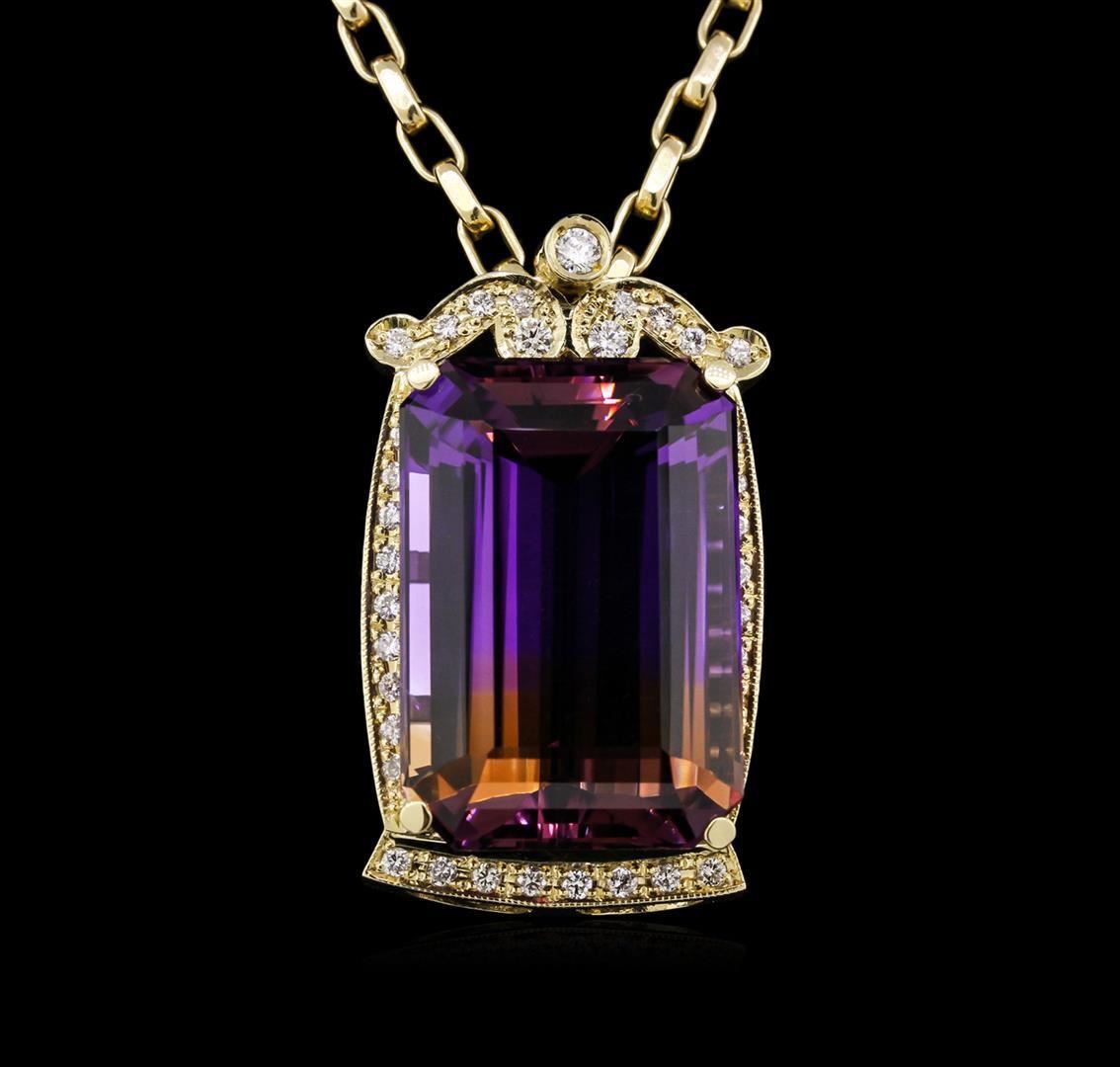 One electronically tested 14KT yellow gold ladies cast & assembled ametrine and diamond pendant with chain. Condition is new, good workmanship. The pendant features an ametrine set within a diamond set frame, completed by a concealed bail. The pendant is supported by an eighteen inch 14KT yellow gold designer style chain, terminating in a lobster claw clasp. Bright polish finish with milgrain detailing. Identified with markings of "14K". Containing: One prong set emerald step cut natural ametrine quartz, measuring 32.00 x 22.00 x 14.20mm, approximate weight of 73.39ct., clarity is eye clean, type I, medium dark, moderately strong, purple color, (GIA P 6/4) to medium, moderately strong, yellowish orange, (GIA y0 5/4), cut is good. Transmitting light with no distortion, transparent. Colored Stone Grading Report attached. Graded in the setting. Ametrine is one of the rarest gemstones in the world. It is actually two gems in one. Ametrine brings together the gold of Citrine and the purple of Amethyst. The unusual color variation found in Ametrine is due to the presence of iron that has oxidized at different states within the same crystal structure. This is a natural process. The world's only known source of Ametrine is the Anahi Mine in Bolivia. The Anahi mine began organized production in the early 1600's by the Spanish Conquistadors. The mine is named after the wife of the first owner, an Ayoreos Tribal Princess named Anahi. The native people of the Ayoreos Tribe inhabit the central plains of South America. Ametrine became popular in the United States about 1980 when material from the Anahi mine in Bolivia began to appear on the market in large quantities. Before 1980 Ametrine was quite unusual and was known as Amethyst-Citrine Quartz, or Golden Amethyst. Ametrine is usually highlighted by cutting the gem into rectangular shapes. Thirty-seven bead & bezel set round brilliant cut diamonds, measuring 3.50 - 2.00 x 1.65mm (depth est.) approximate total weight of 37 Stones = 1.32ct. Graded in the setting. Clarity SI-1 to I-1. Color G -- I. Total Weight of Colored Stones 73.39ct. Total Weight of Diamonds 1.32ct. Total Weight of Pendant With Chain 40.20gm. AIG Appraised.