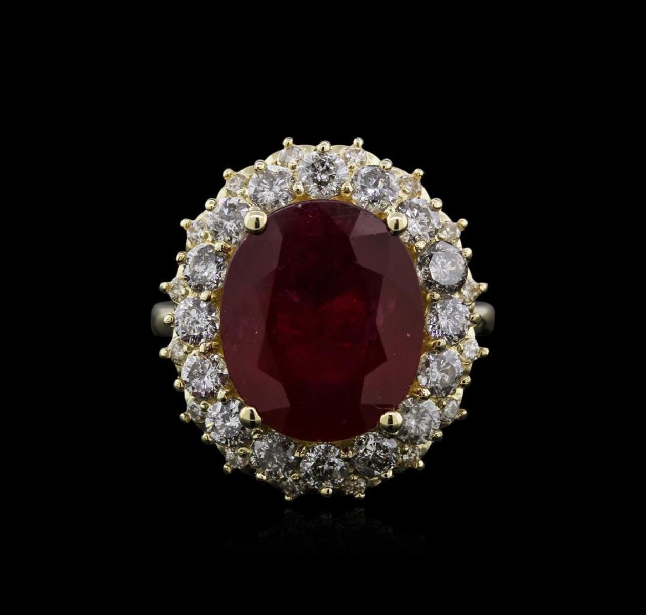 One electronically tested 14KT yellow gold ladies cast ruby and diamond ring with a bright polish finish. Identified with markings of "K14". Condition is new. Containing: One prong set oval modified brilliant cut natural ruby, measuring 13.98 x 11.68 x 5.83mm, approximate weight of 8.00ct., clarity is heavily included, type II, medium dark, very slightly brownish, strongly purplish red color, (GIA stpR 6/3), cut is good. Sixteen prong set round brilliant cut diamonds, measuring 2.80 - 2.80 x 1.68mm (depth est.) approximate total weight of 16 Stones = 1.29ct. Clarity: I-2 to I-3. Color: J - K, Cut is Good. Sixteen prong set round brilliant cut diamonds, measuring 1.50 - 1.50 x 0.90mm (depth est.) approximate total weight of 16 Stones = 0.20ct. Clarity: I-2 to I-3. Color: J - K, Cut is Good. Diamonds and colored gemstones are graded in the mounting, unless otherwise stated. Colored gemstones are presumed to have been subjected to commonly used enhancement processes. Total Weight of Colored Stones 8.00ct. Total Weight of Diamonds 1.48ct. Total Weight of Ring 9.10 grams. GGL Appraised.