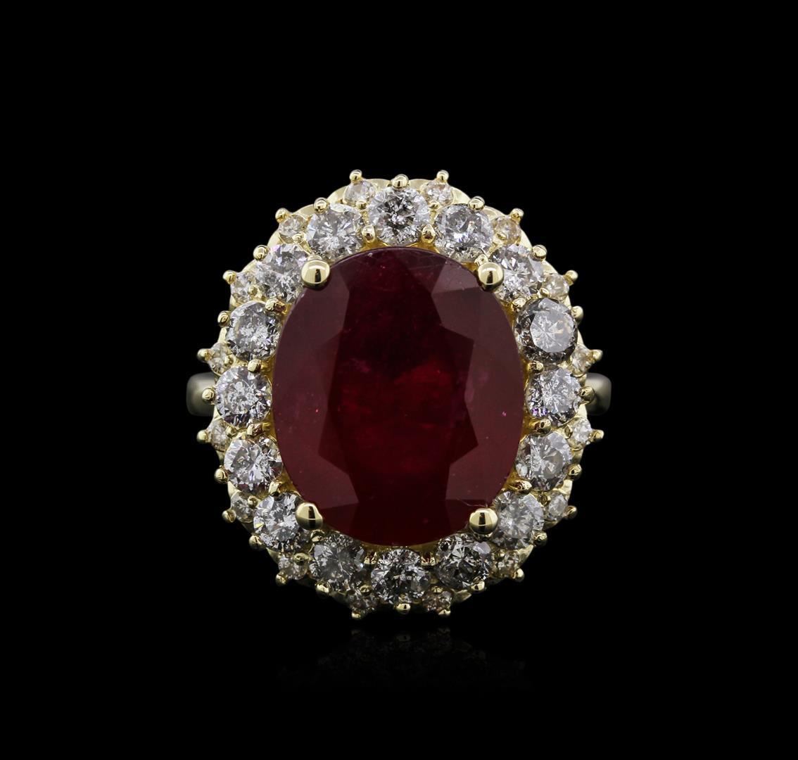 One electronically tested 14KT yellow gold ladies cast ruby and diamond ring with a bright polish finish. Identified with markings of "K14". Condition is new. Containing: One prong set oval modified brilliant cut natural ruby, measuring 13.98 x 11.68 x 5.83mm, approximate weight of 8.00 ct., clarity is heavily included, type II, medium dark, very slightly brownish, strongly purplish red color, (GIA stpR 6/3), cut is good. Sixteen prong set round brilliant cut diamonds, measuring 2.80 - 2.80 x 1.68mm (depth est.) approximate total weight of 16 Stones = 1.29ct. Clarity: I-2 to I-3. Color: J - K, Cut is Good. Sixteen prong set round brilliant cut diamonds, measuring 1.50 - 1.50 x 0.90mm (depth est.) approximate total weight of 16 Stones = 0.20 ct. Clarity: I-2 to I-3. Color: J - K, Cut is Good. Diamonds and colored gemstones are graded in the mounting, unless otherwise stated. Colored gemstones are presumed to have been subjected to commonly used enhancement processes. Total Weight of Colored Stones 8.00 ct. Total Weight of Diamonds 1.48ct. Total Weight of Ring 9.10 grams. GGL Appraised.