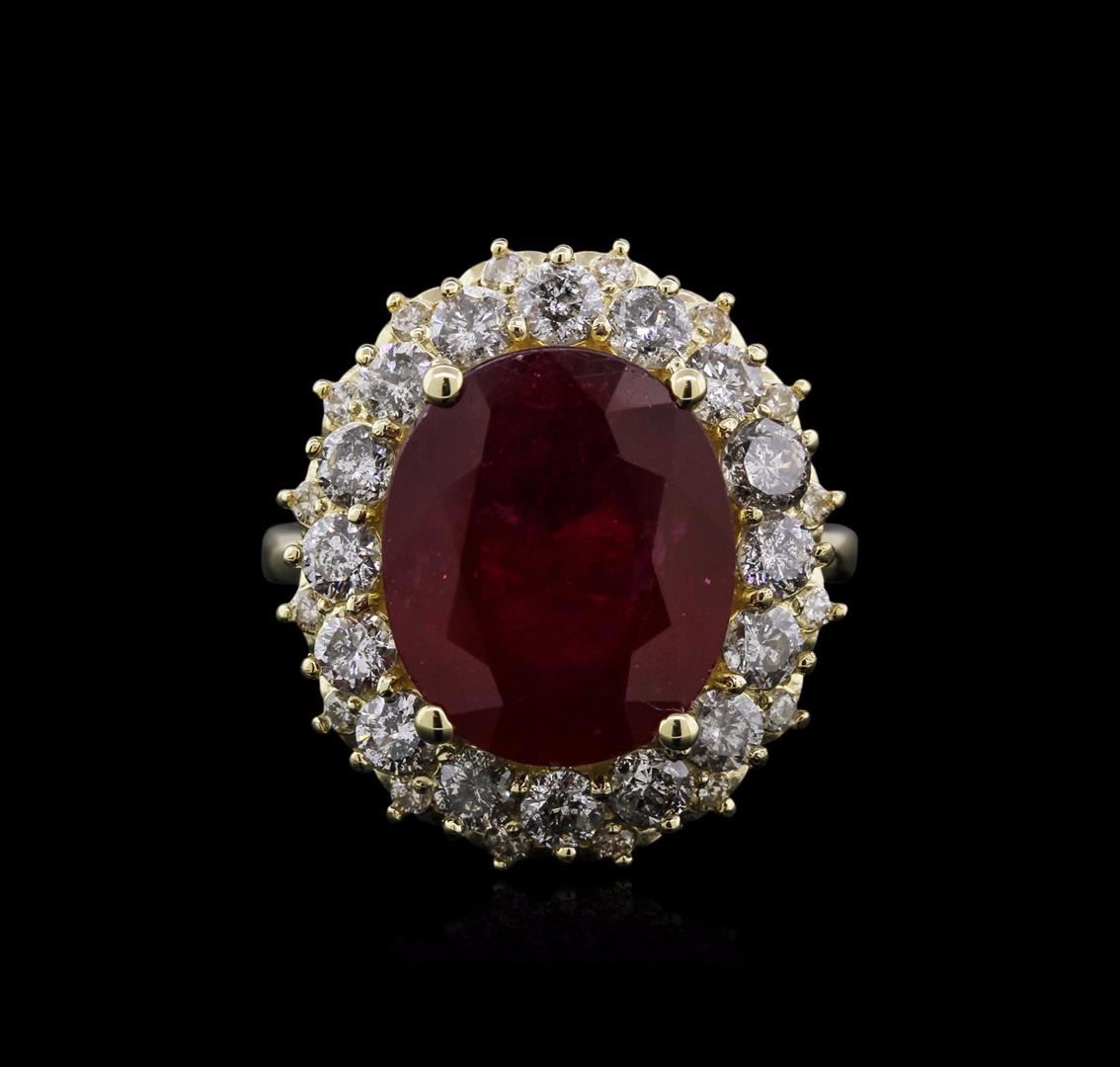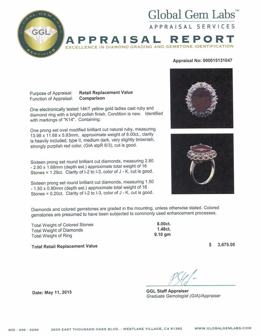 One electronically tested 14KT yellow gold ladies cast ruby and diamond ring with a bright polish finish. Identified with markings of "K14". Condition is new. Containing: One prong set oval modified brilliant cut natural ruby, measuring 13.98 x 11.68 x 5.83mm, approximate weight of 8.00ct., clarity is heavily included, type II, medium dark, very slightly brownish, strongly purplish red color, (GIA stpR 6/3), cut is good. Sixteen prong set round brilliant cut diamonds, measuring 2.80 - 2.80 x 1.68mm (depth est.) approximate total weight of 16 Stones = 1.29ct. Clarity: I-2 to I-3. Color: J - K, Cut is Good. Sixteen prong set round brilliant cut diamonds, measuring 1.50 - 1.50 x 0.90mm (depth est.) approximate total weight of 16 Stones = 0.20ct. Clarity: I-2 to I-3. Color: J - K, Cut is Good. Diamonds and colored gemstones are graded in the mounting, unless otherwise stated. Colored gemstones are presumed to have been subjected to commonly used enhancement processes. Total Weight of Colored Stones 8.00ct. Total Weight of Diamonds 1.48ct. Total Weight of Ring 9.10 grams. GGL Appraised at $3,675.00.