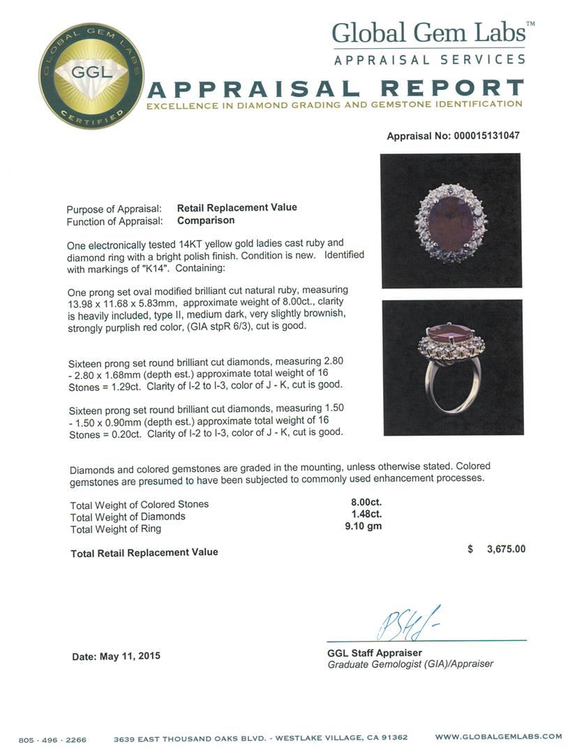 One electronically tested 14KT yellow gold ladies cast ruby and diamond ring with a bright polish finish. Identified with markings of "K14". Condition is new. Containing: One prong set oval modified brilliant cut natural ruby, measuring 13.98 x 11.68 x 5.83mm, approximate weight of 8.00ct., clarity is heavily included, type II, medium dark, very slightly brownish, strongly purplish red color, (GIA stpR 6/3), cut is good. Sixteen prong set round brilliant cut diamonds, measuring 2.80 - 2.80 x 1.68mm (depth est.) approximate total weight of 16 Stones = 1.29ct. Clarity: I-2 to I-3. Color: J - K, Cut is Good. Sixteen prong set round brilliant cut diamonds, measuring 1.50 - 1.50 x 0.90mm (depth est.) approximate total weight of 16 Stones = 0.20ct. Clarity: I-2 to I-3. Color: J - K, Cut is Good. Diamonds and colored gemstones are graded in the mounting, unless otherwise stated. Colored gemstones are presumed to have been subjected to commonly used enhancement processes. Total Weight of Colored Stones 8.00ct. Total Weight of Diamonds 1.48ct. Total Weight of Ring 9.10 grams. GGL Appraised at $3,675.00.