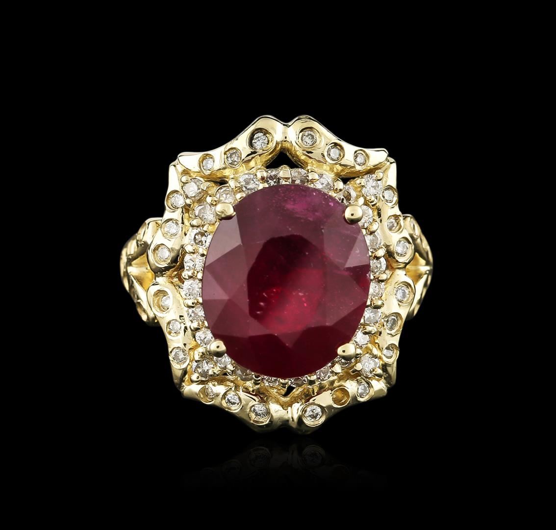 One electronically tested 14KT yellow gold ladies cast ruby and diamond ring with a bright polish finish. Identified with markings of "K14". Condition is new. Containing: One prong set oval modified brilliant cut natural ruby, measuring 12.50 x 10.75 x 7.10mm, approximate weight of 8.01ct., clarity is heavily included, type II, cut is good. Sixty-Six prong set round brilliant cut diamonds, measuring 1.30 - 1.30 x 0.78mm (depth est.) approximate total weight of 66 Stones = 0.53ct. Clarity: SI-2 to I-1. Color: K - L, Cut is Good. Diamonds and colored gemstones are graded in the mounting, unless otherwise stated. Colored gemstones are presumed to have been subjected to commonly used enhancement processes. Total Weight of Colored Stones 8.01ct. Total Weight of Diamonds 0.53ct. Total Weight of Ring 9.90 grams. GGL Appraised at $3,660.00.