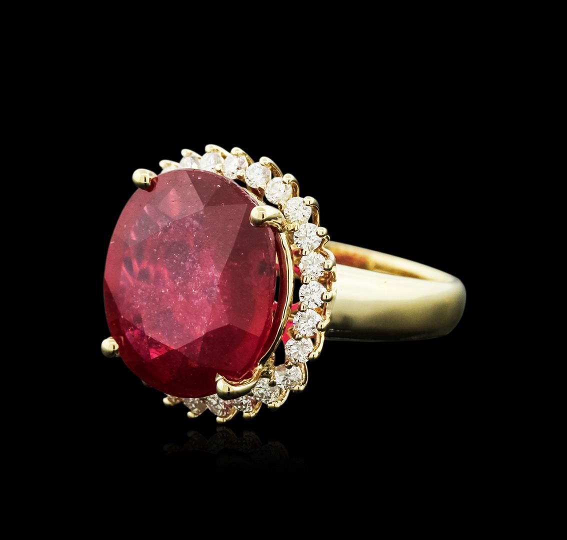 One electronically tested 14KT yellow gold ladies cast ruby and diamond ring with a bright polish finish. Identified with markings of "14K". Condition is new. Containing: One prong set oval modified brilliant cut natural ruby, measuring 15.20 x 13.70 x 5.50mm, approximate weight of 8.06ct., clarity is heavily included, type II, medium dark, moderately strong, strongly purplish red color, (GIA stpR 6/4), cut is good. Thirty-Two prong set round brilliant cut diamonds, measuring 1.70 - 1.70 x 1.02mm (depth est.) approximate total weight of 32 Stones = 0.57ct. Clarity: SI-1 to SI-2. Color: I - J, Cut is Good. Colored gemstones are presumed to have been subjected to commonly used enhancement processes. All diamonds and colored gemstones are graded in the mounting, unless otherwise stated. Total Weight of Colored Stones 8.06ct. Total Weight of Diamonds 0.57ct. Total Weight of Ring 7.40 grams. GGL Appraised at $4,095.00.