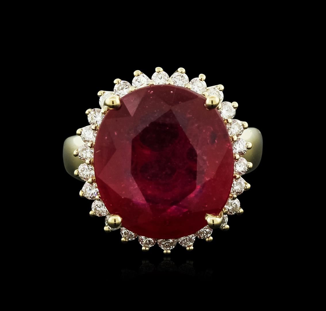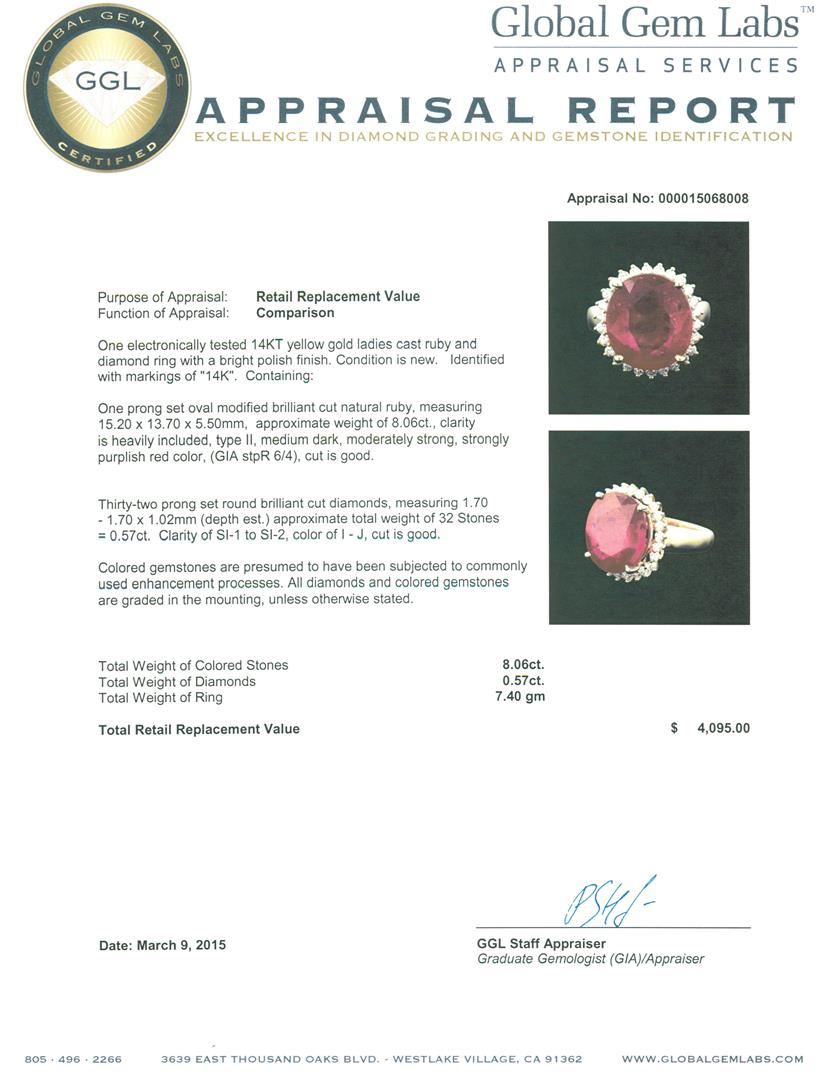 One electronically tested 14KT yellow gold ladies cast ruby and diamond ring with a bright polish finish. Identified with markings of "14K". Condition is new. Containing: One prong set oval modified brilliant cut natural ruby, measuring 15.20 x 13.70 x 5.50mm, approximate weight of 8.06ct., clarity is heavily included, type II, medium dark, moderately strong, strongly purplish red color, (GIA stpR 6/4), cut is good. Thirty-Two prong set round brilliant cut diamonds, measuring 1.70 - 1.70 x 1.02mm (depth est.) approximate total weight of 32 Stones = 0.57ct. Clarity: SI-1 to SI-2. Color: I - J, Cut is Good. Colored gemstones are presumed to have been subjected to commonly used enhancement processes. All diamonds and colored gemstones are graded in the mounting, unless otherwise stated. Total Weight of Colored Stones 8.06ct. Total Weight of Diamonds 0.57ct. Total Weight of Ring 7.40 grams. GGL Appraised at $4,095.00.