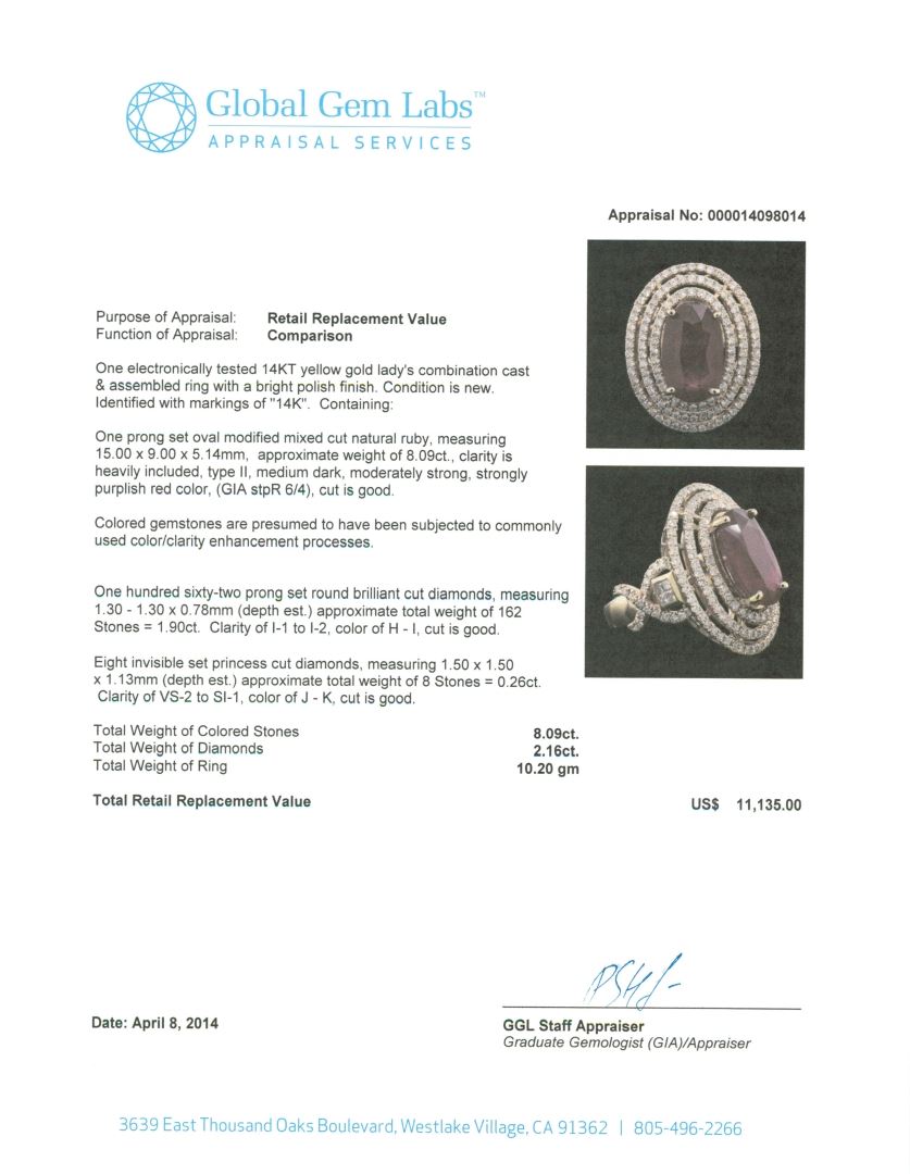 One electronically tested 14KT yellow gold Ladies combination cast & assembled ring with a bright polish finish. Condition is new. Identified with markings of "14K". Containing: One prong set oval modified mixed cut natural ruby, measuring 15.00 x 9.00 x 5.14mm, approximate weight of 8.09ct., clarity is heavily included, type II, medium dark, moderately strong, strongly purplish red color, (GIA stpR 6/4), cut is good. Colored gemstones are presumed to have been subjected to commonly used color/clarity enhancement processes. One Hundred Sixty-Two prong set round brilliant cut diamonds, measuring 1.30 - 1.30 x 0.78mm (depth est.) approximate. Total Weight of 162 Stones = 1.90ct. Clarity: I-1 to I-2. Color: H - I, Cut is Good. Eight invisible set princess cut diamonds, measuring 1.50 x 1.50 x 1.13mm (depth est.) approximate. Total Weight of 8 Stones = 0.26ct. Clarity: VS-2 to SI-1. Color: J - K, Cut is Good. Total Weight of Colored Stones 8.09ct. Total Weight of Diamonds 2.16ct. Total Weight of Ring 10.20 grams. GGL Appraised at $11,135.00.